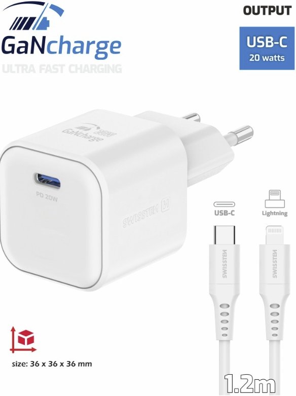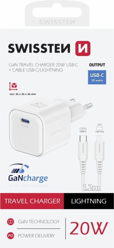 Swissten 3арядное устройство GaN USB-C 20W PD + Kабель для передачи данных USB-C - Lightning 1.2m