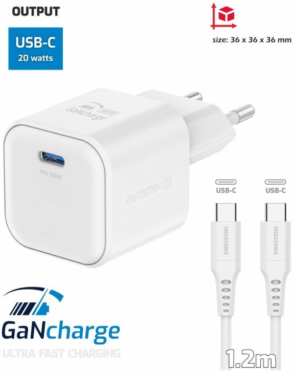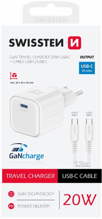 Swissten 3арядное устройство GaN USB-C 20W PD + Kабель для передачи данных USB-C-USB-C 1.2m
