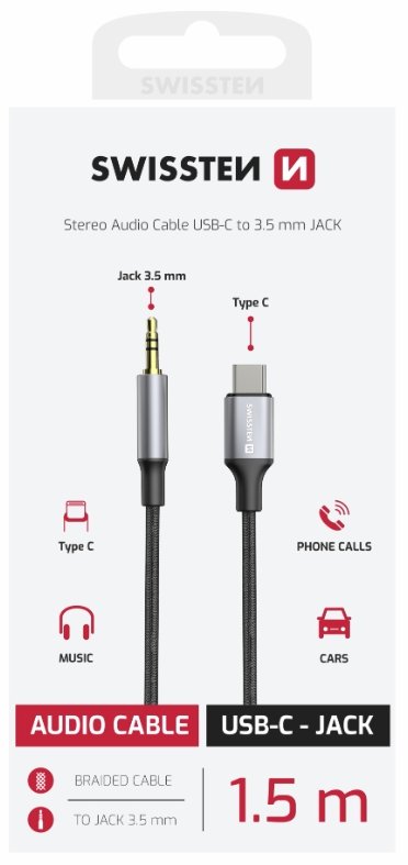 Аудиоадаптер SWISSTEN Textile USB-C/3,5 мм JACK черного цвета длиной 1,5 м - отличный выбор. Благодаря этому адаптеру вы без проблем сможете подключить любимые наушники или колонки с входом AUX 3,5 мм к устройствам с разъемом USB-C, что особенно ценится пользователями современных телефонов и планшетов без традиционного аудиоразъема.