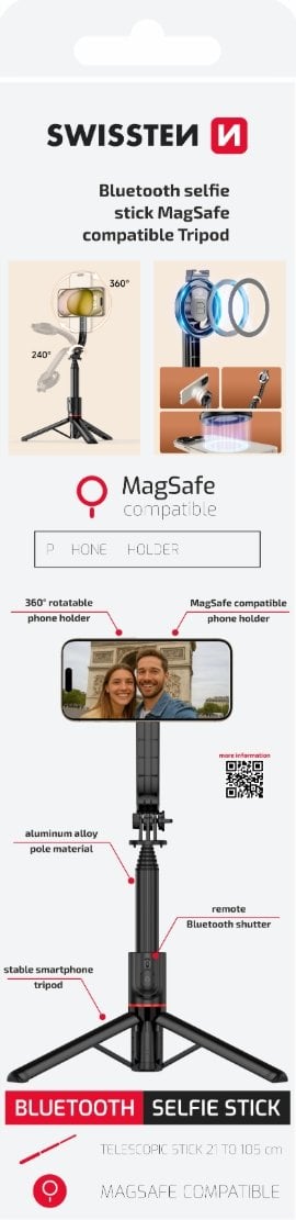 Штатив-палка для селфи SWISSTEN Bluetooth с поддержкой MagSafe - идеальное комплексное решение для фотосъемки, записи видео и прямых трансляций. Компактная и лёгкая конструкция облегчает переноску, а телескопическая штанга из алюминиевого сплава выдвигается от 21 до 105 см, обеспечивая гибкость при съемке с любого ракурса. Складное основание штатива с силиконовыми противоскользящими ножками обеспечивает стабилизацию снимков на любой поверхности, как в помещении, так и на улице.