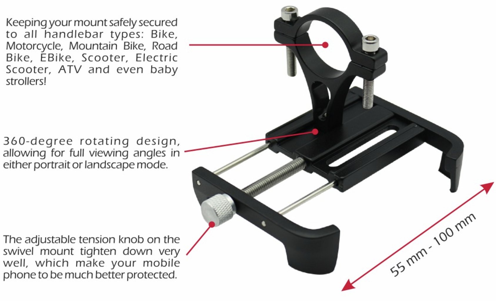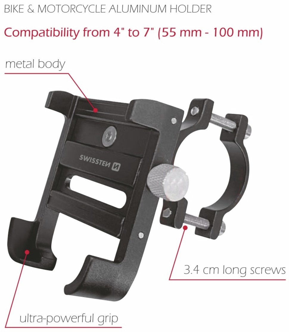 Металлический держатель для смартфона 4-7″, который можно использовать для велосипедов, электровелосипедов, самокатов и т. д. Упакован в блистер SWISSTEN. Можно установить для смартфонов шириной 55-100 мм, т.е. диагональю 4″- 7".