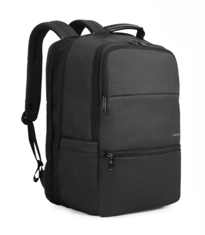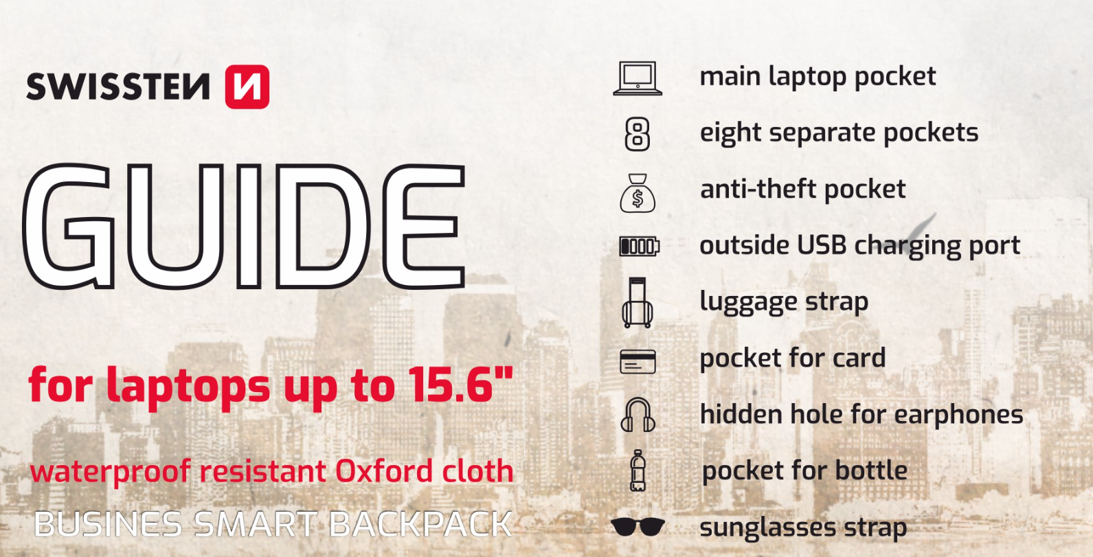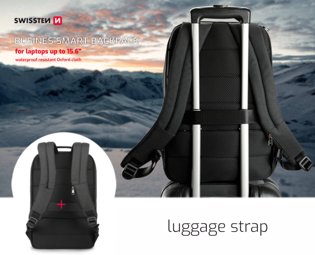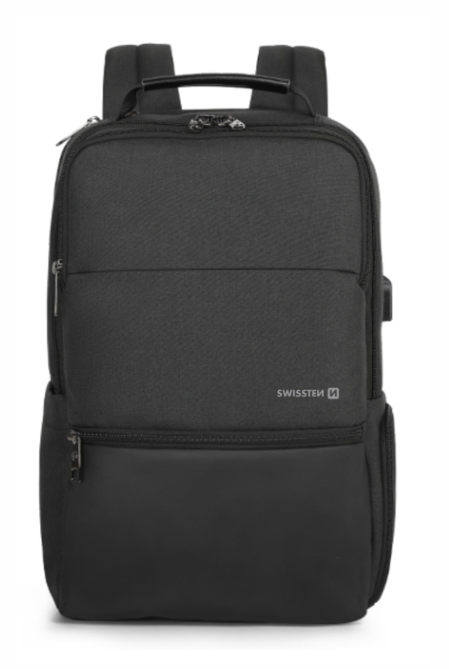 Рюкзак Swissten для ноутбуков диагональю до 15,6 дюймов с множеством практичных карманов и отделений с портом USB для зарядки смартфона.