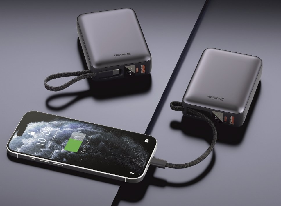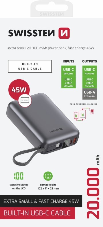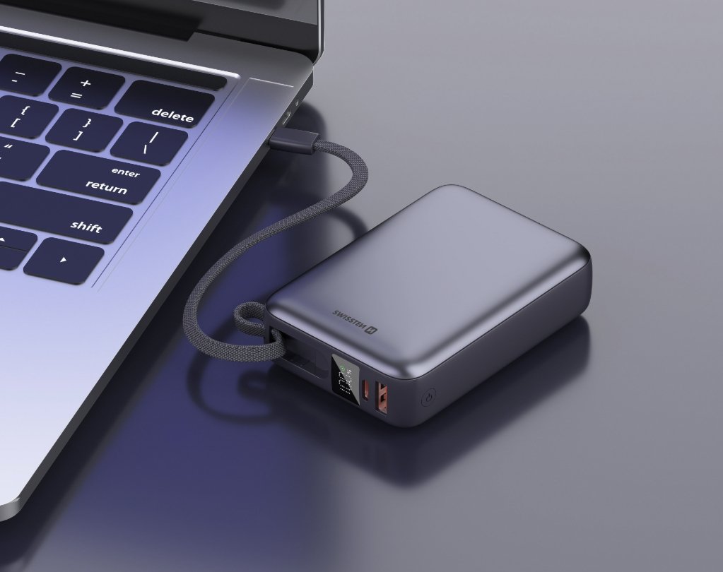 SWISSTEN POWER BANK 20000 мАч 45W со встроенным кабелем USB-C - идеальное решение для тех, кому нужно много энергии в дороге.