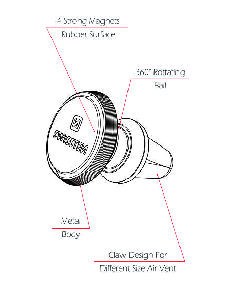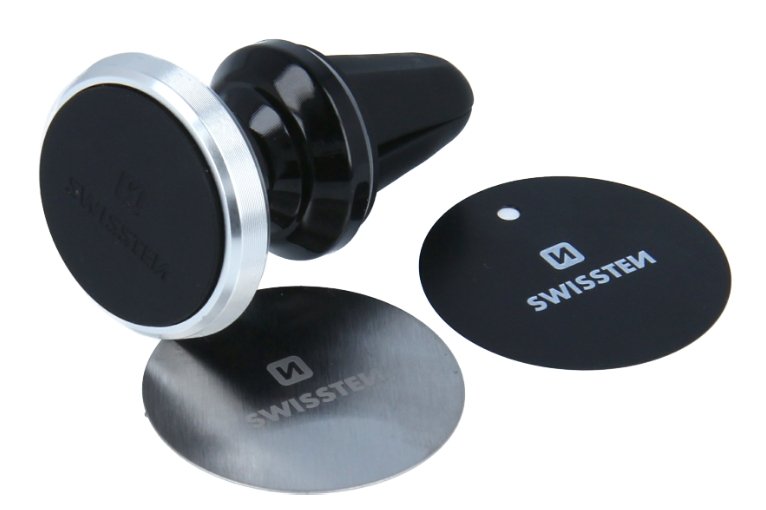 <p>Металлический магнитный автомобильный держатель элегантного дизайна. Он оснащен шестью магнитами для лучшей безопасности телефона. Прорезиненная поверхность защищает телефон от царапин и предотвращает скольжение телефона. Упакован в блистер Swissten.</p>