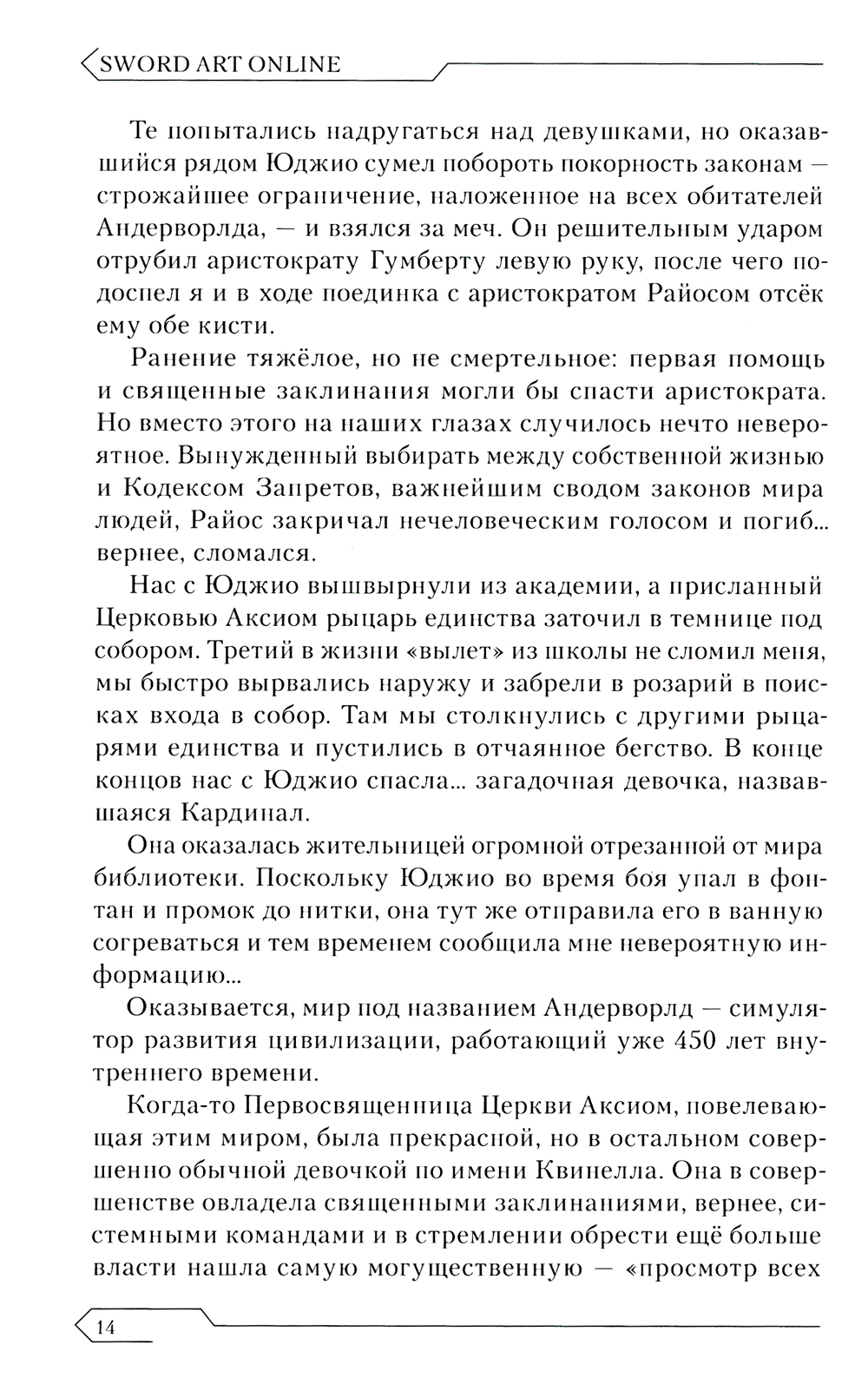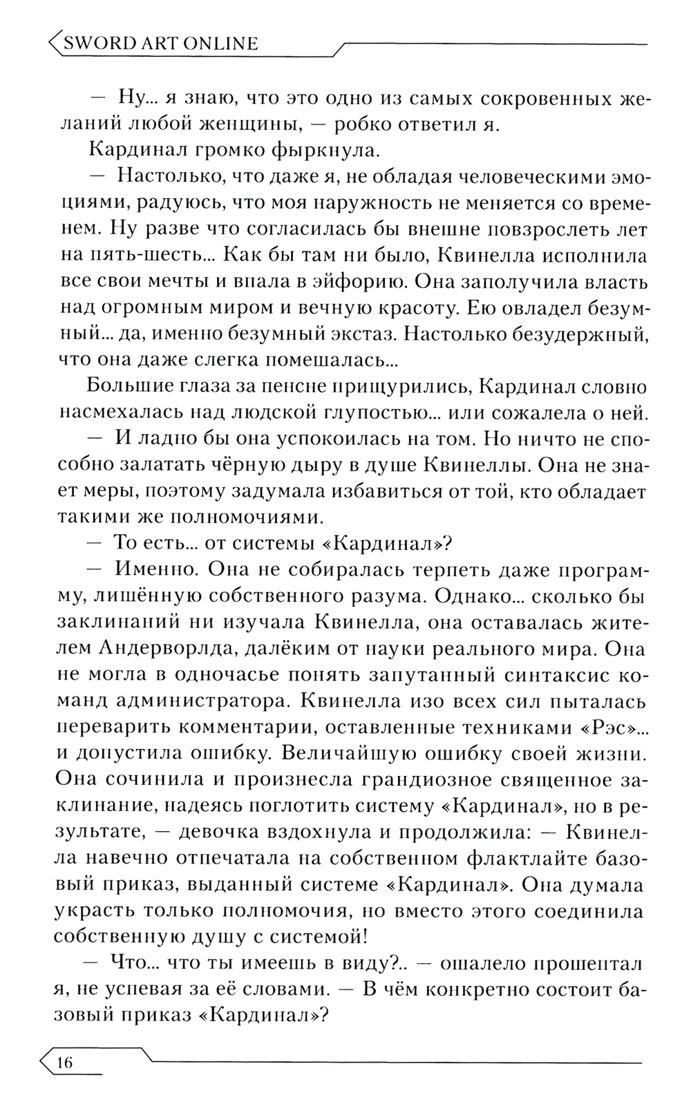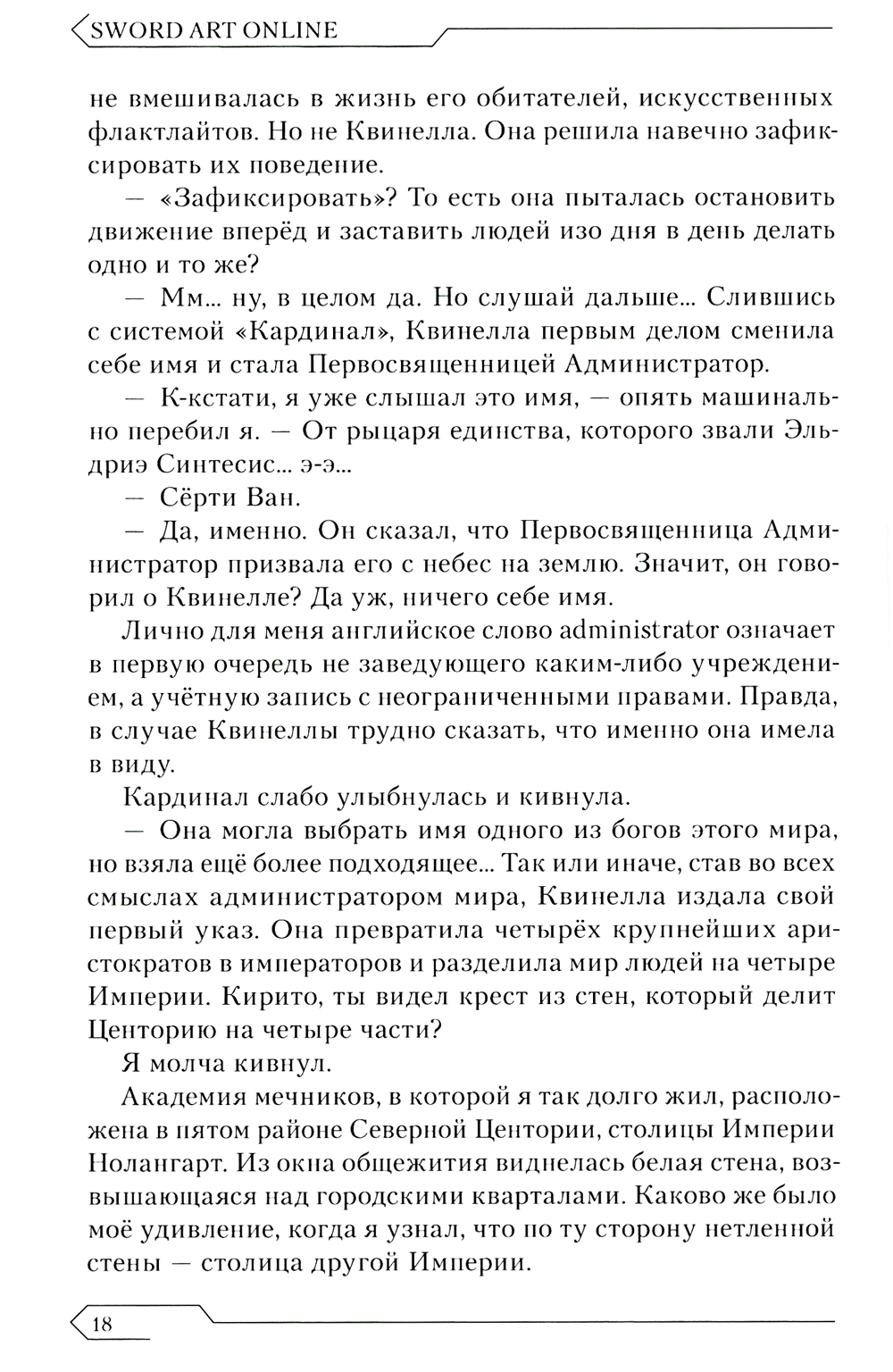 Наконец-то Юджио исполнил мечту своего детства и воссоединился с Алисой. Но в ней больше не осталось ничего от той маленькой девочки из деревни Рулид. Алиса пришла за Кирито и Юджио как за преступниками, нарушившими Кодекс Запретов. Она ничего не помнит о своём детстве и называет себя рыцарем единства. Их бросают в подземелье Центрального собора, символа власти Церкви Аксиом, но благодаря смекалке Кирито им удаётся сбежать. Затем им помогает таинственная девочка по имени Кардинал, которая знает, что Кирито пришёл в этот мир «извне». Наконец, Кирито и Юджио отправляются в путь к вершине башни, чтобы вернуть прежнюю Алису! Но на их пути встают сильные воины, рождённые при помощи ритуала синтеза...| Издательство | ИД Истари Комикс |