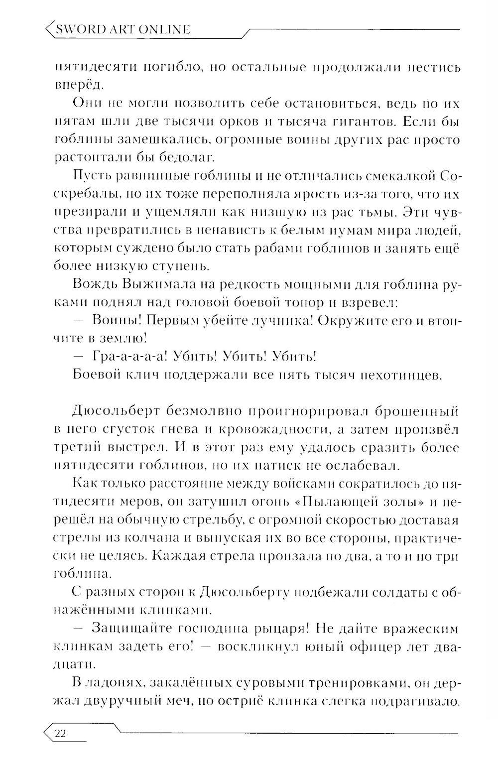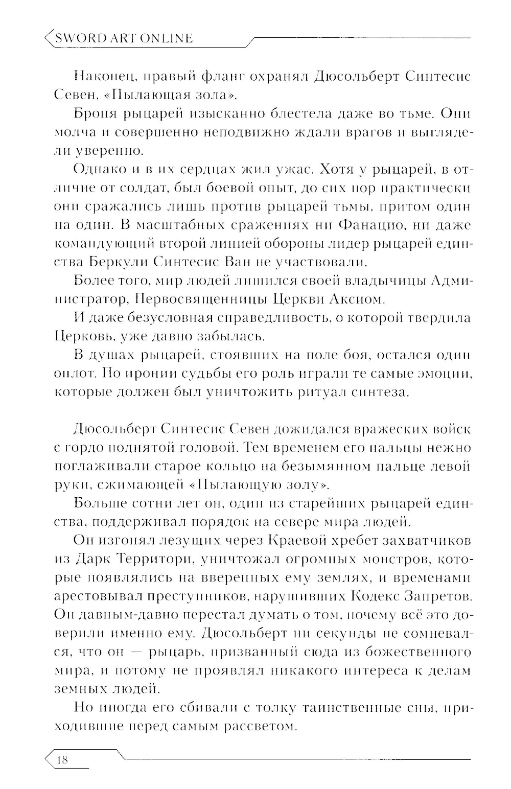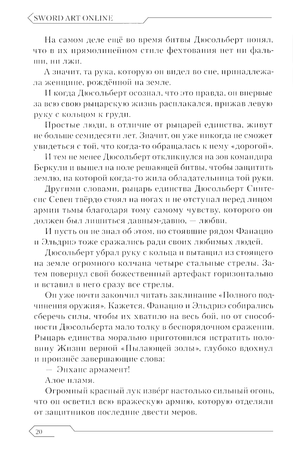 Пятьдесят тысяч солдат бога тьмы Вектора, или Габриэля Миллера, против пятитысячной армии защитников под командованием рыцаря единства Беркули. Фанацио и другие рыцари единства доблестно сражаются, стремясь одолеть превосходящего по численности врага, но горные гоблины хитростью проникают за линию фронта и направляются в тыл. Юным кадетам Ронье и Тизе, ухаживающим за впавшим в кому Кирито, угрожает смертельная опасность. Однако самый коварный стратег в армии тьмы - это глава гильдии чёрных магов Ди Ай Эль, которая надеется уничтожить всю армию защитников одним ужасным заклинанием... И куда же отправится Асуна, только что вошедшая в Андерворлд?!
