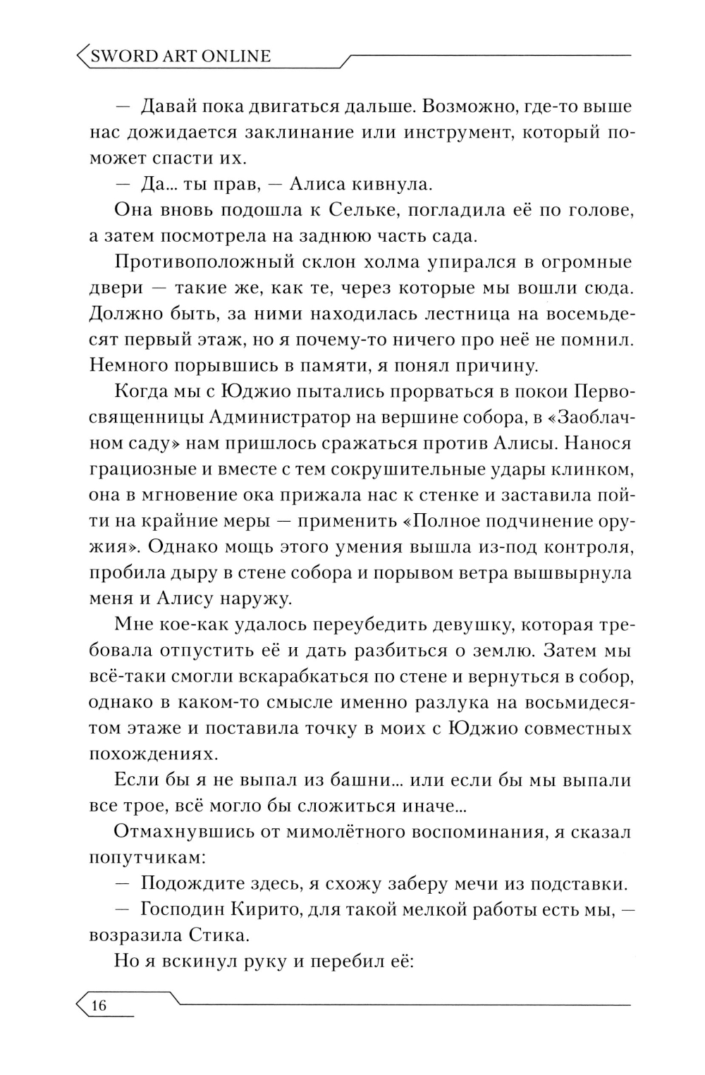 В «Заоблачном саду» на восьмидесятом этаже Центрального собора отряд во главе с Кирито обнаружил до боли знакомых девушек, погружённых в окаменелый сон. Но чтобы разбудить их и узнать, что за злодей угрожает Андерворлду, Кирито придётся полететь на планету Админу, где плетутся зловещие козни. Тем временем в мире Unital Ring Синон, Силика и остальные пытаются победить опасного босса монстров. Рейд неплохо проявляет себя даже в отсутствие таких сильных бойцов, как Кирито, Асуна и Алиса, но во время битвы страсти накаляются всё сильнее...| Издательство | ИД Истари Комикс |