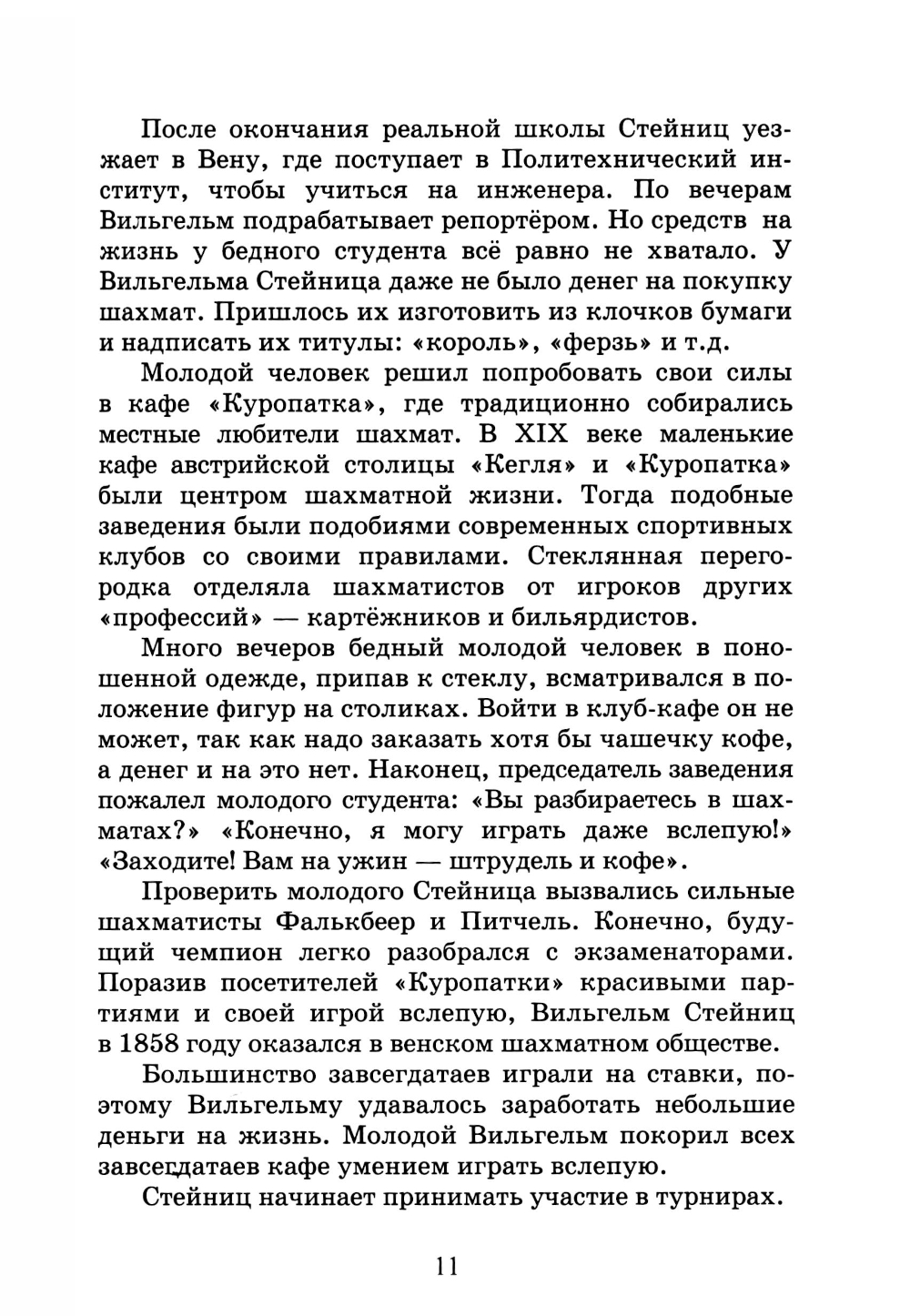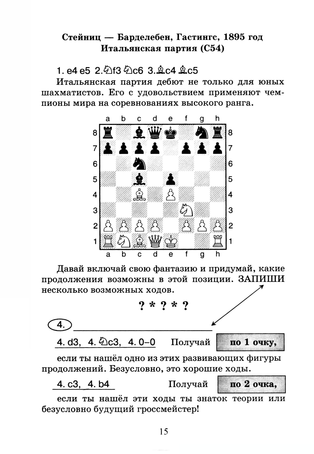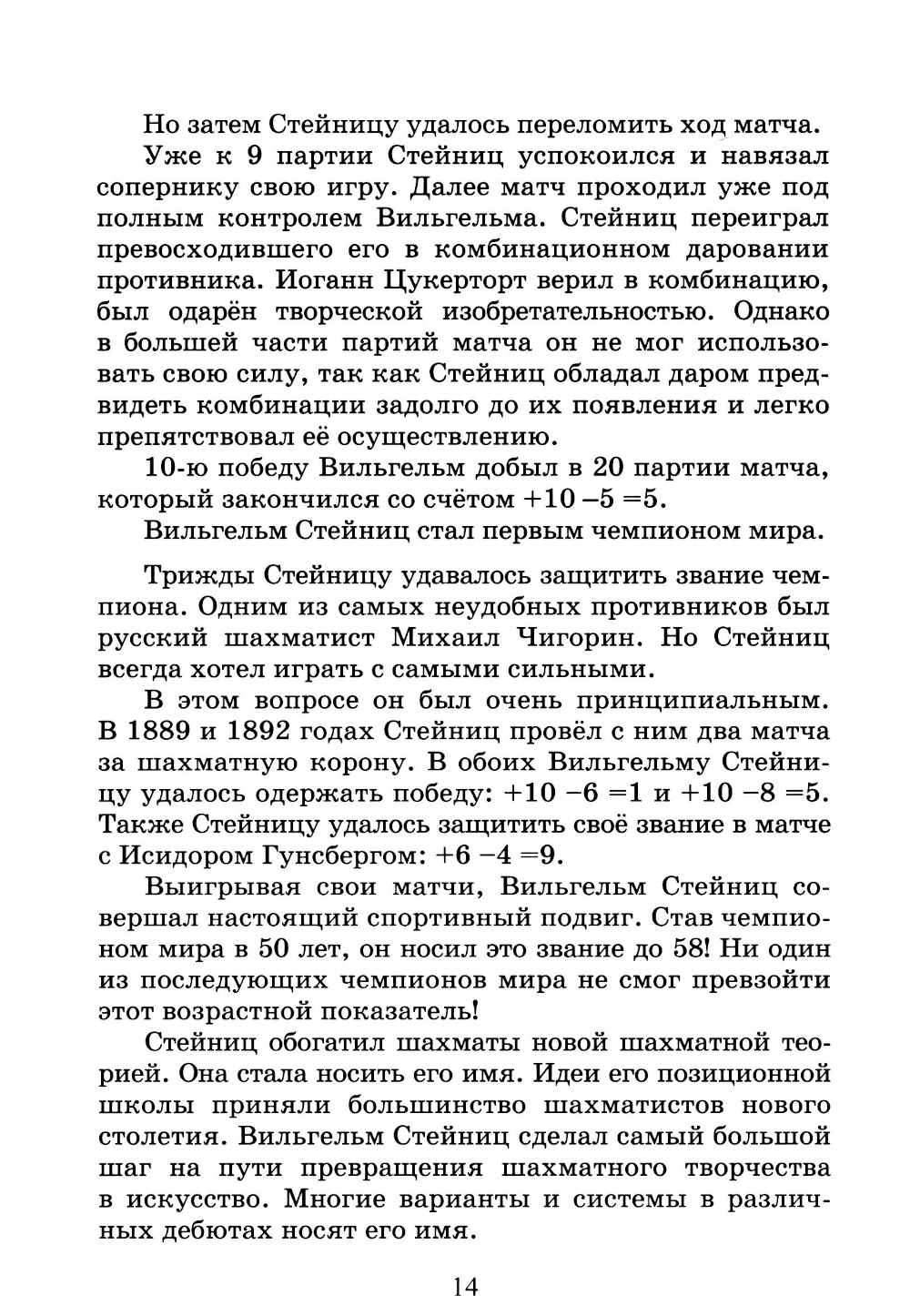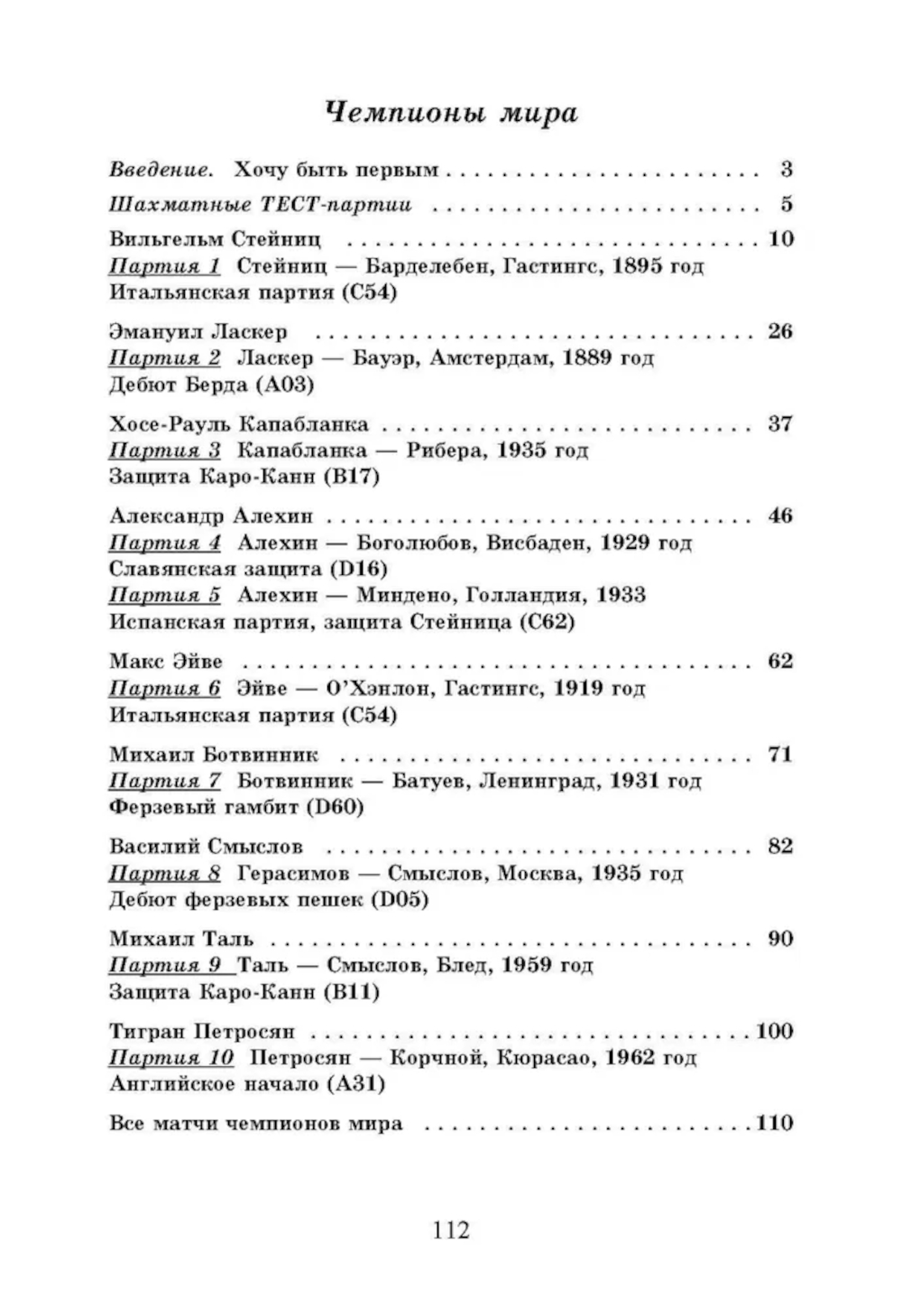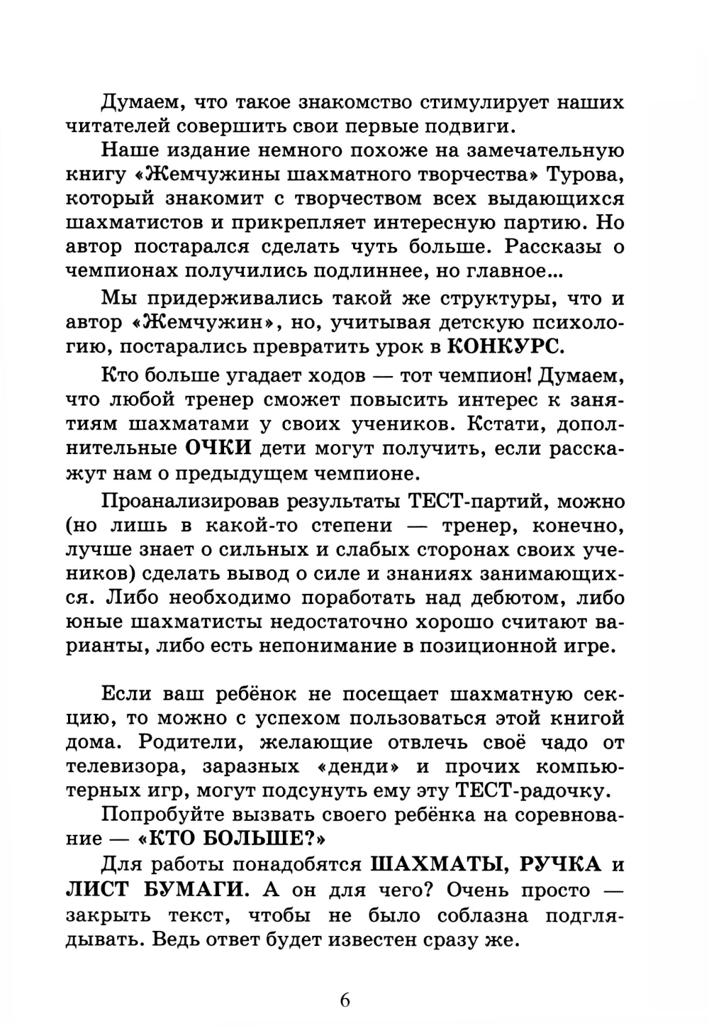 Шахматисты часто спрашивают тренера: «В какую силу я играю?». Посмотрев наши тест-партии, будущий чемпион узнает свой примерный рейтинг, а также существенно повысит уровень собственной игры! Эта книжка - отличный помощник для тренера! Её можно использовать на занятиях, превращая каждый урок в кон-курс «Кто сегодня чемпион?». Проанализировав результаты тест-партий, тренер сделает вывод о силе и знаниях занимающихся и поймёт, над чем работать. Если ребёнок занимается дома, то у вас есть возможность узнать «Кто круче?!» - папа, дедушка или внук. Наша книжка поможет прекрасно провести время и многое узнать! Книга также содержит учебный материал о шахматной истории и чемпионах мира. По статистике, про Капабланку слышало менее половины учащихся в отдельно взятом классе. А такие великие шахматисты: Ботвинник, Смыслов, Таль, Петросян - как будто и не существовали! Данная книга станет хорошим ликбезом для шахматят, и, прочитав её, юные дарования обязательно блеснут знаниями о Стейнице, Ласкере и Алехине.| Издательство | Изд.Калиниченко |
