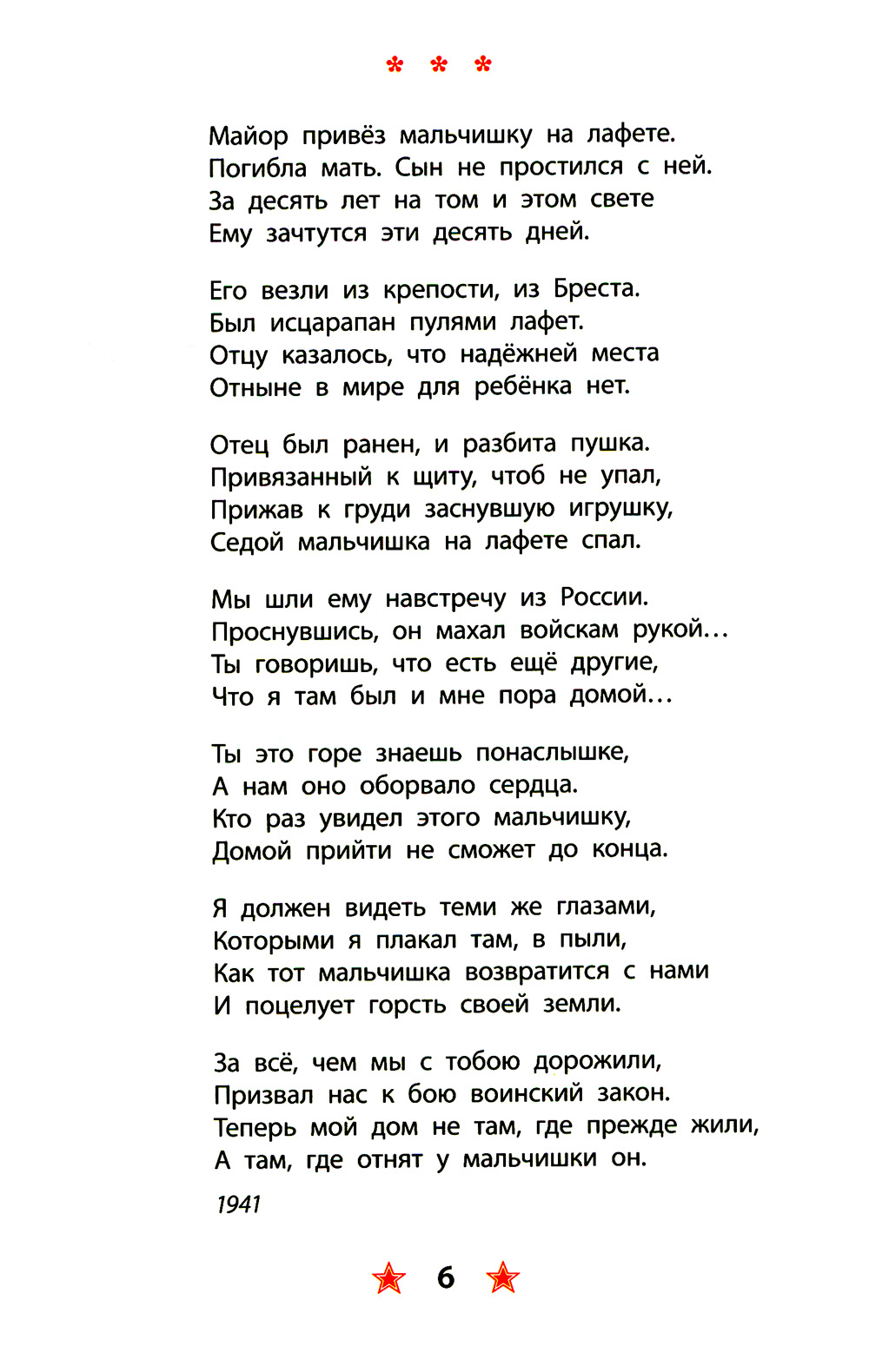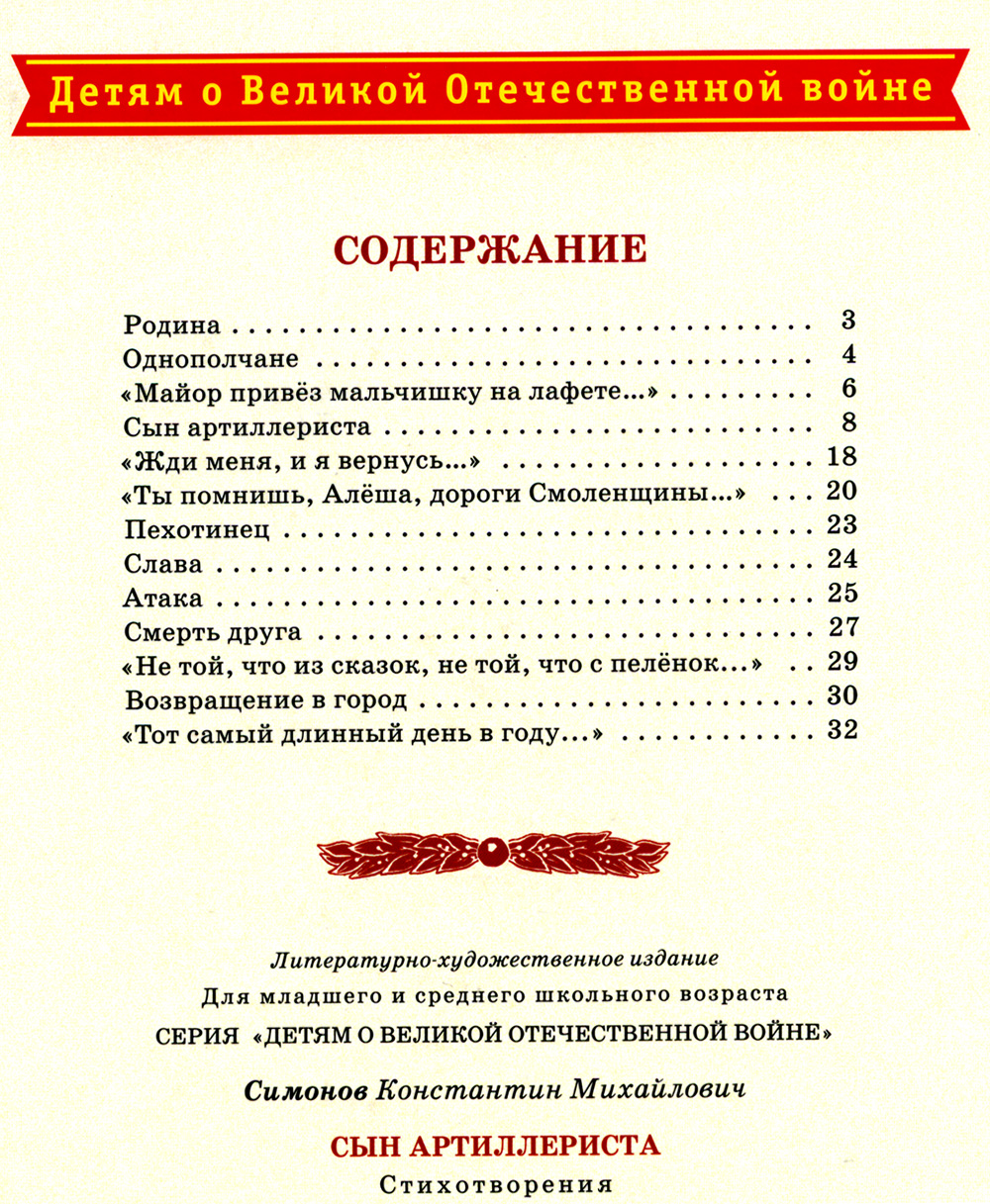 В сборник поэта, прозаика и военного корреспондента Константина Симонова (1915-1979) вошли стихотворения, посвященные ратному подвигу и событиям Великой Отечественной войны. Для младшего и среднего школьного возраста.| Издательство | Детская литература |