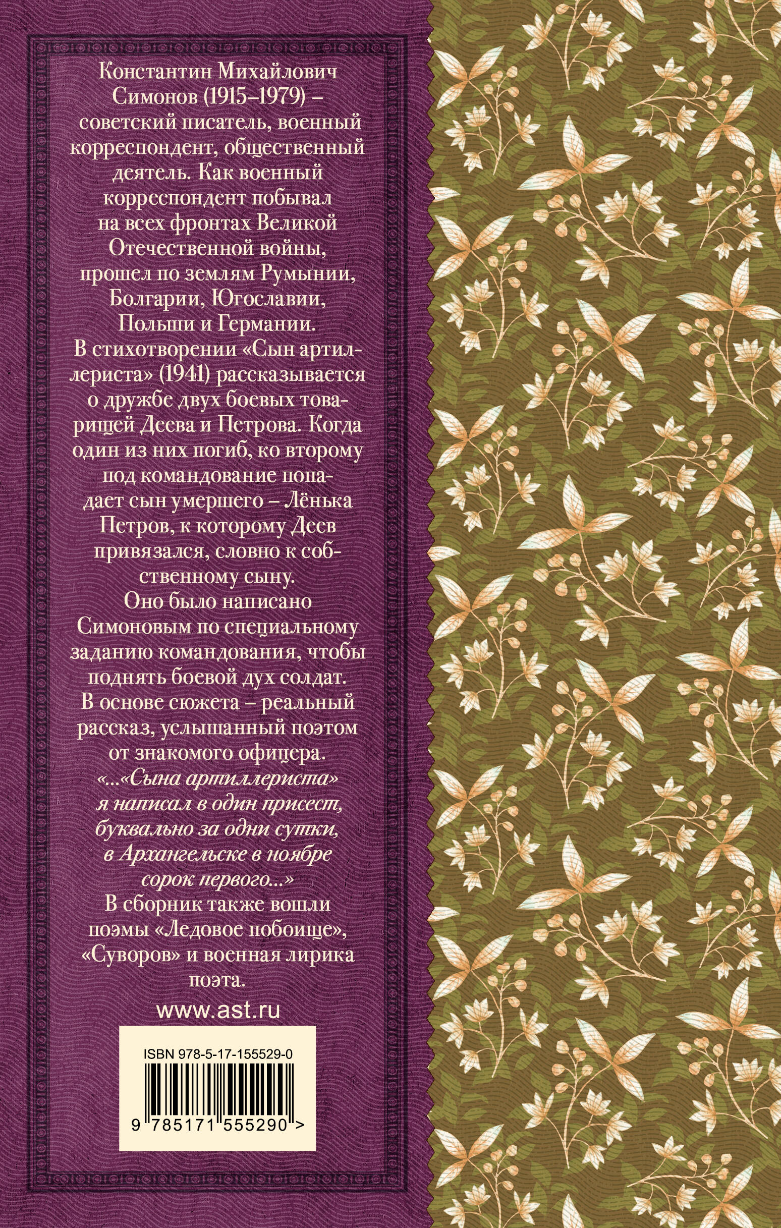 Константин Михайлович Симонов (1915 - 1979) - советский писатель, военный корреспондент, общественный деятель. Как военный корреспондент побывал на всех фронтах Великой Отечественной войны, прошел по землям Румынии, Болгарии, Югославии, Польши и Германии. Поэма "Сын артиллериста" (1941) повествует о дружбе двух боевых товарищей Деева и Петрова. Когда один из них погиб, ко второму под командование попадает сын умершего - Лёнька Петров, к которому Деев привязался, словно к собственному сыну. Поэма была написана Симоновым по специальному заданию командования, с целью поднять боевой дух солдат. В основе сюжета - реальный рассказ, услышанный поэтом у знакомого офицера. "… "Сына артиллериста" я написал в один присест, буквально за одни сутки, в Архангельске в ноябре сорок первого…" В сборник также вошли поэмы "Ледовое побоище", "Суворов" и военная лирика поэта.