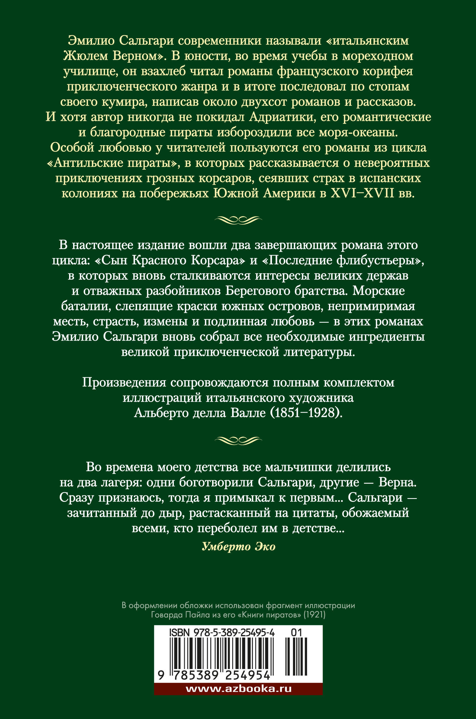 Эмилио Сальгари современники называли "итальянским Жюлем Верном". В юности, во время учебы в мореходном училище, он взахлеб читал романы французского корифея приключенческого жанра и в итоге последовал по стопам своего кумира, написав около двухсот романов и рассказов. И хотя автор никогда не покидал Адриатики, его романтические и благородные пираты избороздили все моря-океаны. Особой любовью у читателей пользуются его романы из цикла "Антильские пираты", в которых рассказывается о невероятных приключениях грозных корсаров, сеявших страх в испанских колониях на побережьях Южной Америки в XVI-XVII вв. В настоящее издание вошли два завершающих романа этого цикла: "Сын Красного Корсара" и "Последние флибустьеры", в которых вновь сталкиваются интересы великих держав и отважных разбойников Берегового братства. Морские баталии, слепящие краски южных островов, непримиримая месть, страсть, измены и подлинная любовь - в этих романах Эмилио Сальгари вновь собрал все необходимые ингредиенты великой приключенческой литературы. Произведения сопровождаются полным комплектом иллюстраций итальянского художника Альберто делла Валле (1851-1928).| Издательство | Азбука-Аттикус Издат.группа ООО |