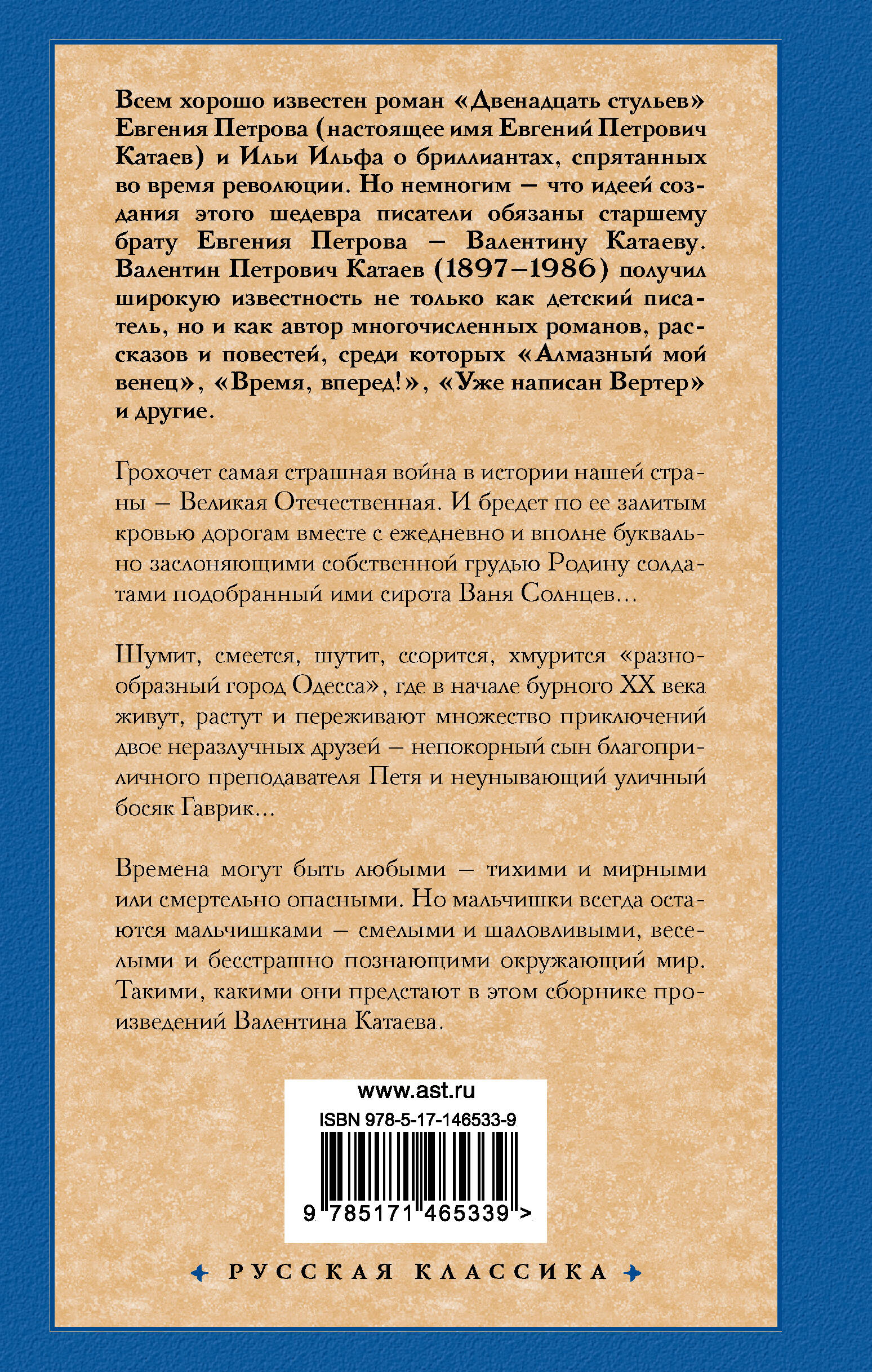 Грохочет самая страшная война в истории нашей страны - Великая Отечественная. И бредет по ее залитым кровью дорогам вместе с ежедневно и вполне буквально заслоняющими собственной грудью Родину солдатами подобранный ими сирота Ваня Солнцев... Шумит, смеется, шутит, ссорится, хмурится "разнообразный город Одесса", где в начале бурного ХХ века живут, растут и переживают множество приключений двое неразлучных друзей - непокорный сын благоприличного преподавателя Петя и неунывающий уличный босяк Гаврик... Времена могут быть любыми - тихими и мирными или смертельно опасными. Но мальчишки всегда остаются мальчишками - смелыми и шаловливыми, веселыми и бесстрашно познающими окружающий мир. Такими, какими они предстают в этом сборнике произведений Валентина Катаева.| Издательство | ИЗДАТЕЛЬСТВО "АСТ" |