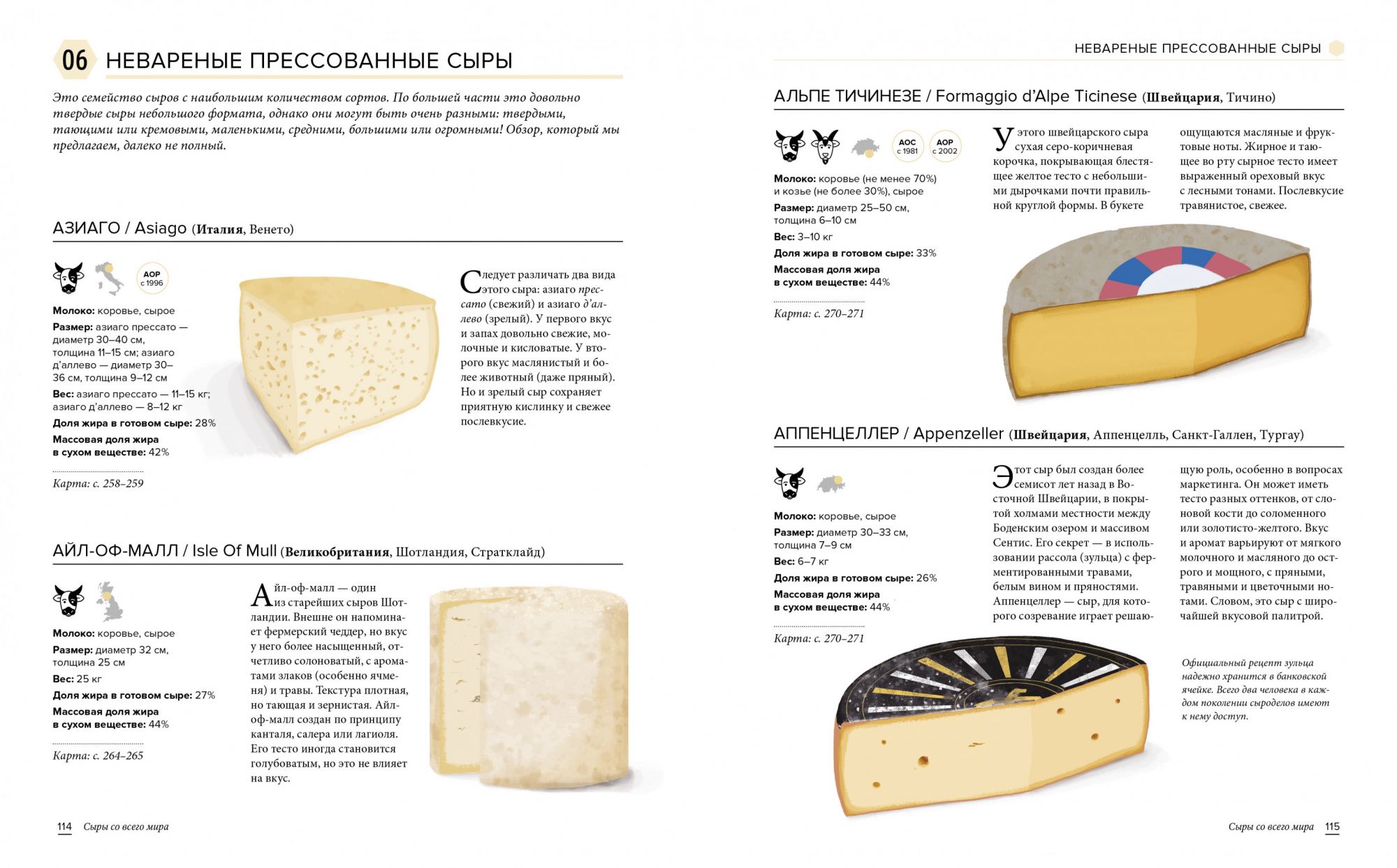 Хотите узнать, почему сыры пахнут носками, откуда в них дырки и как отличить вкусную и полезную плесень от несъедобной? Тристан Сикар, профессиональный журналист и владелец сырной лавки в историческом центре Лилля, ответит на любой вопрос без лишнего снобизма и заумных слов. В сотрудничестве с талантливым художником Янисом Варуцикосом он создал уникальный путеводитель по миру сыров, снабженный понятной инфографикой и великолепными иллюстрациями. Сначала вы совершите путешествие в прошлое, к истокам сыроделия, и побываете на ферме, чтобы проследить за всеми этапами производства. Затем сможете изучить 11 семейств сыров и оценить их необычайное разнообразие: в книге представлены описания более 400 сыров, от всеми любимых феты, моцареллы и грюйера до редких находок вроде американского козьего бижу или новозеландского буйволиного волкано. Далее вас ждет увлекательное исследование сырной географии: на 20 картах наглядно показаны все терруары и территории производства сыров, описанных в предыдущем разделе. И наконец, практические рекомендации: как правильно нарезать и подавать сыры, сочетать их с напитками и другими продуктами, составлять дегустационные тарелки и даже упаковывать сыры разной формы. Эта насыщенная информацией книга - настоящая находка как для профессиональных сыроделов, так и для тех, кто просто любит сыр.