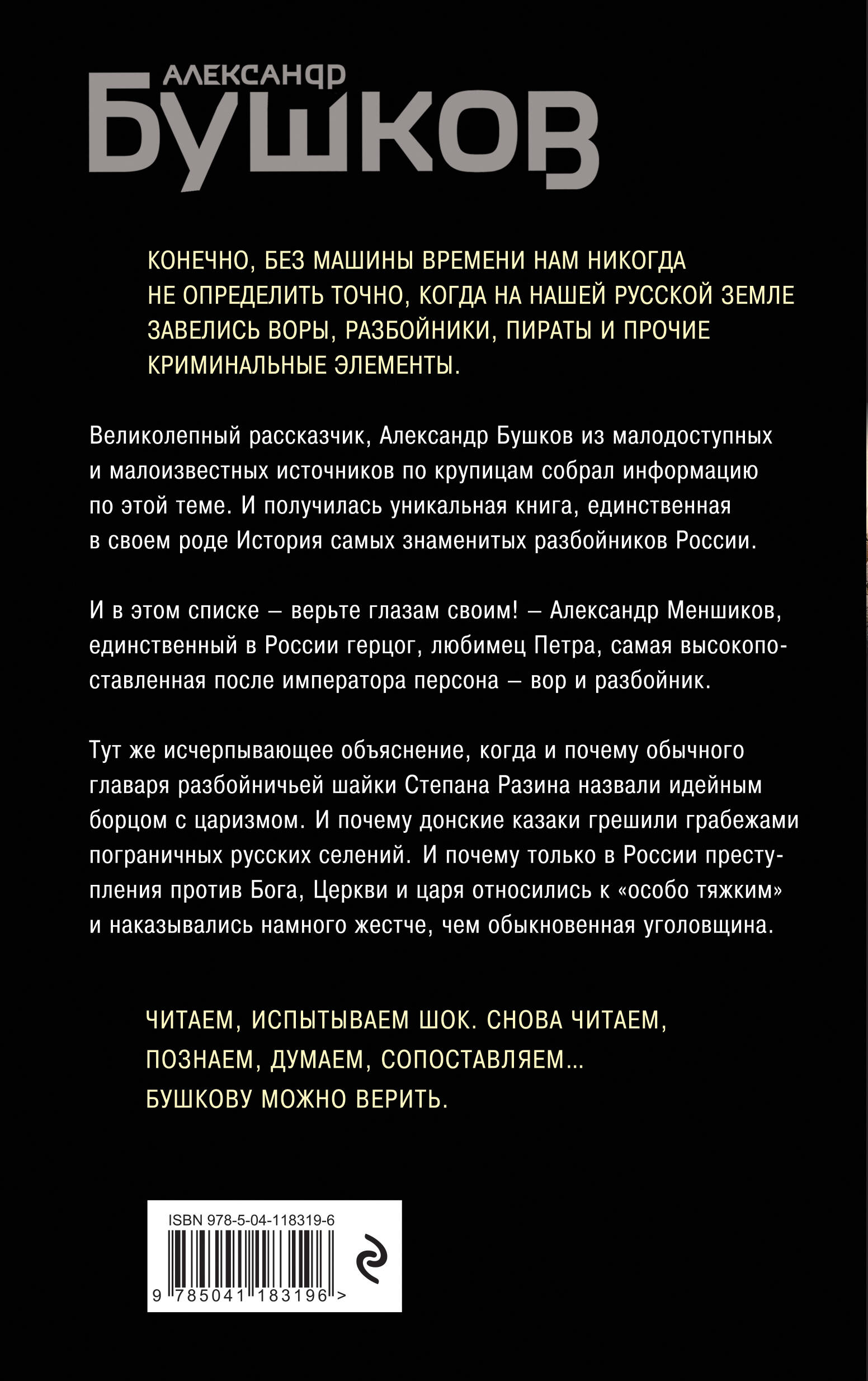 История зачастую отождествляет Героев и Разбойников. У британцев - Робин Гуд. У нас - Степан Разин. Здесь собраны истории самых знаменитых разбойников России, начиная задолго до эпохи Ивана Грозного. Конечно, без машины времени нам никогда не определить точно, когда на нашей русской земле завелись воры, разбойники, пираты и прочие криминальные элементы. Великолепный рассказчик Александр Бушков из малодоступных и малоизвестных источников по крупицам собрал информацию по этой теме. И получилась уникальная книга, единственная в своем роде История самых знаменитых разбойников России. И в этом списке - верьте глазам своим! - Александр Меншиков, единственный в России герцог, любимец Петра, самая высокопоставленная после императора персона - вор и разбойник. Тут же исчерпывающее объяснение, когда и почему обычного главаря разбойничьей шайки Степана Разина назвали идейным борцом с царизмом. И почему донские казаки грешили грабежами пограничных русских селений. И почему только в России преступления против Бога, Церкви и царя относились к «особо тяжким» и наказывались намного жестче, чем обыкновенная уголовщина. Читаем, испытываем шок. Снова читаем, познаём, думаем, сопоставляем… Бушкову можно верить.| Издательство | ООО "Издательство "Эксмо" |