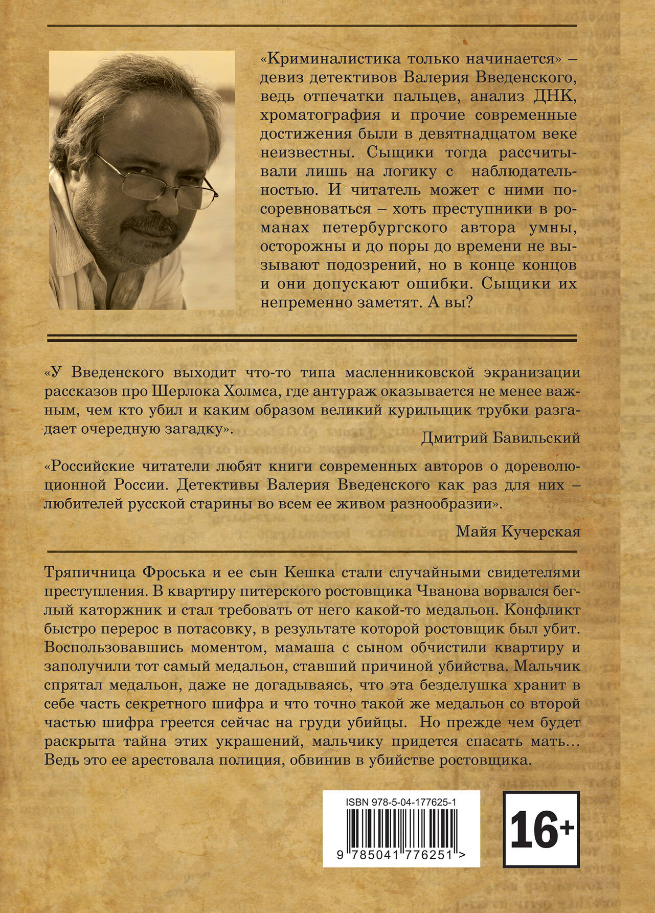 Роман об эпохе возрождения русской криминалистики. Тряпичница Фроська и её сын Кешка стали случайными свидетелями преступления. В квартиру питерского ростовщика Чванова ворвался беглый каторжник и стал требовать от него какой-то медальон. Конфликт быстро перерос в потасовку, в результате которой ростовщик был убит. Воспользовавшись моментом, мамаша с сыном обчистили квартиру и заполучили тот самый медальон, ставший причиной убийства. Мальчик спрятал медальон, даже не догадываясь, что эта безделушка хранит в себе часть секретного шифра и что точно такой же медальон со второй частью шифра греется сейчас на груди убийцы. Но прежде чем будет раскрыта тайна этих украшений, мальчику придется спасать мать… Ведь это ее арестовала полиция, обвинив в убийстве ростовщика. «Криминалистика только начинается» - девиз детективов Валерия Введенского. Ведь отпечатки пальцев, анализ ДНК, хроматография и прочие современные достижения не были известны в девятнадцатом веке. Сыщики тогда рассчитывали лишь на логику да наблюдательность. И читатель может с ними в этом посоревноваться. Да, преступники в романах петербургского автора умны, осторожны и до поры до времени не вызывают подозрений. Но в конце концов и они допускают ошибки. Сыщики их непременно заметят. А вы? «У Введенского выходит что-то типа масленниковской экранизации рассказов про Шерлока Холмса, где антураж оказывается не менее важным, чем кто убил и каким образом великий курильщик трубки разгадает очередную загадку». - Дмитрий Бавильский «Российские читатели любят книги современных авторов о дореволюционной России. Детективы Валерия Введенского как раз для них - любителей русской старины во всем ее живом разнообразии». - Майя Кучерская
