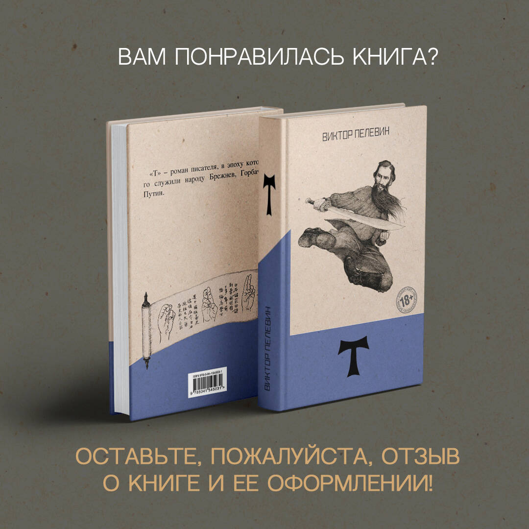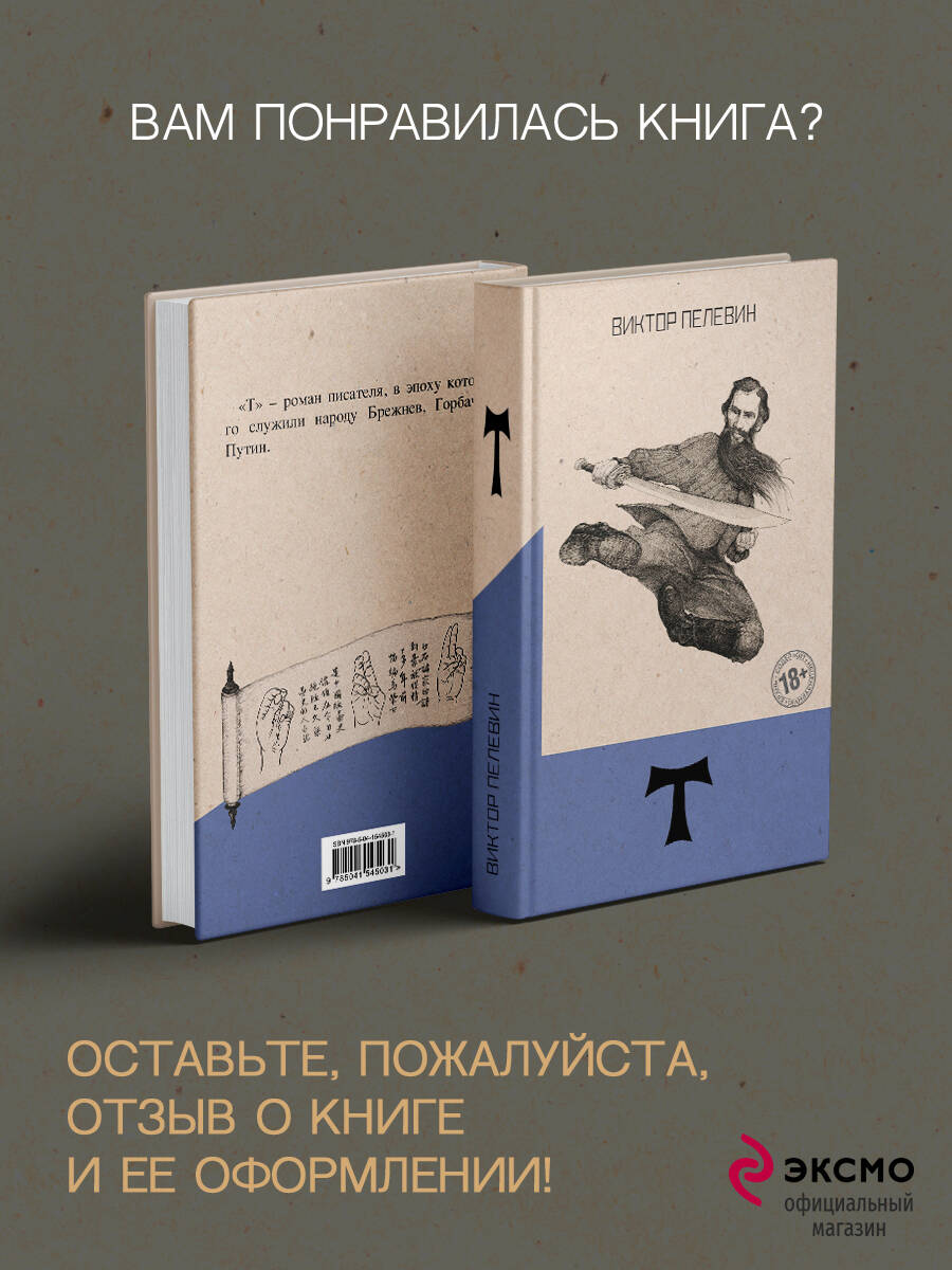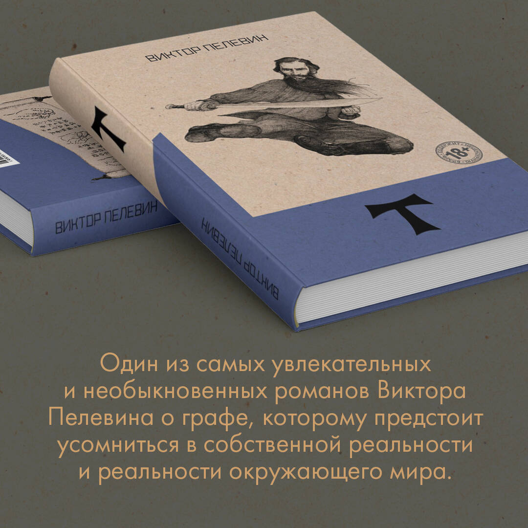 «T» - роман писателя, в эпоху которого служили народу Брежнев, Горбачев, Путин. Роман повествует о пути мастера боевых искусств графа Т. (вероятно, имеется в виду Лев Толстой), который бежал из своего дома от царской охранки и с неведомой ему целью пробирается в Оптину Пустынь, которая в контексте данного романа обретает черты не знаменитой обители православия, а то ли некой Шамбалы, то ли непонятного места духовного просветления, существующего в реальном мире. Потом «оптина» превращается в «соловьёвскую», и тут уже всё становится ещё более непонятным и запутанным. По дороге в Оптину Пустынь граф Т. встречает каббалистическое существо Ариэля. Ариэль вместе с пятью литературными неграми сами придумывают и пишут рассказ о графе Т., о чём Ариэль и рассказывает графу. Однако Т. не очень нравится быть в подчинении у каких-то пятерых сомнительных типов. А потому он пытается перехватить у них инициативу и сам стать автором. Роман Виктора Пелевина стал финалистом конкурса национальной литературной премии «Большая книга» и занял в итоге третье место, а в народном голосовании - первое место. Переиздается в серии «Народное собрание сочинений Виктор Пелевина», которая за последние десять лет успела приобрести статус культовой и стать букинистической редкостью.| Издательство | ООО "Издательство "Эксмо" |