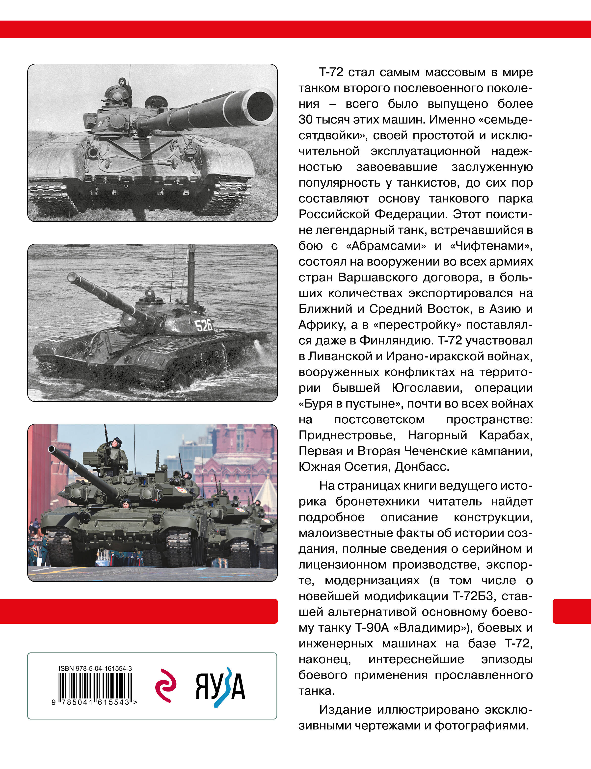 Т-72 стал самым массовым в мире танком второго послевоенного поколения - всего было выпущено более 30 тысяч этих машин. Именно «семьдесят двойки», своей простотой и исключительной эксплуатационной надежностью завоевавшие заслуженную популярность у танкистов, до сих пор составляют основу танкового парка Российской Федерации. Этот поистине легендарный танк, встречавшийся в бою с «Абрамсами» и «Чифтенами», состоял на вооружении во всех армиях стран Варшавского договора, в больших количествах экспортировался на Ближний и Средний Восток, в Азию и Африку, а в «перестройку» поставлялся даже в Финляндию. Т-72 участвовал в ливанской и ирано-иракской войнах, вооруженных конфликтах на территории бывшей Югославии, операции «Буря в пустыне», почти во всех войнах на постсоветском пространстве: Приднестровье, Нагорный Карабах, Первая и Вторая Чеченские кампании, Южная Осетия, Донбасс. На страницах книги ведущего историка бронетехники читатель найдет подробное описание конструкции, малоизвестные факты об истории создания, полные сведения о серийном и лицензионном производстве, экспорте, модернизациях (в том числе о новейшей модификации Т-72Б3, ставшей альтернативой основному боевому танку Т-90А «Владимир»), боевых и инженерных машинах на базе Т-72, наконец, интереснейшие эпизоды боевого применения прославленного танка. Издание иллюстрировано эксклюзивными чертежами и фотографиями.| Издательство | Эксмо |