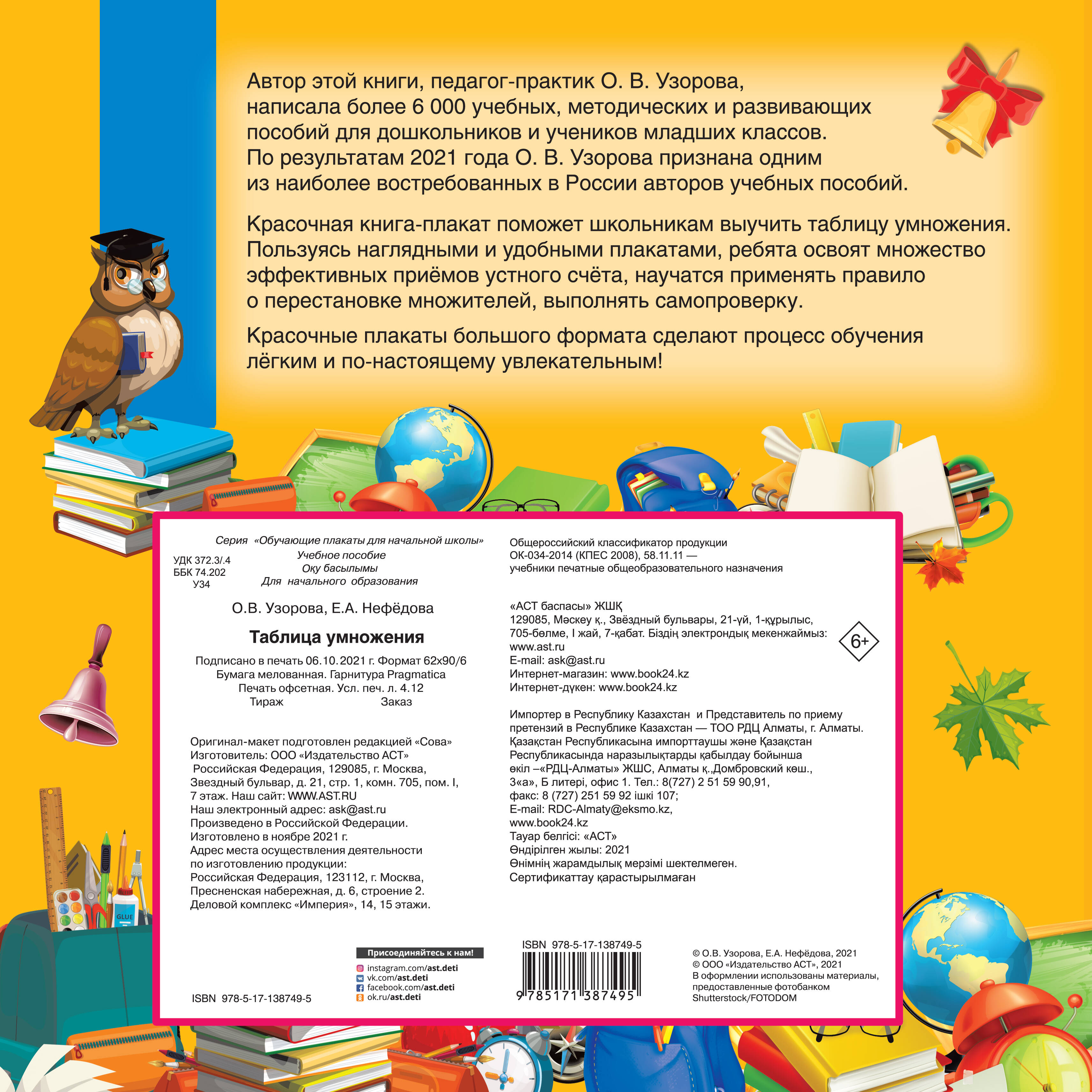 О чём эта книга «Таблица умножения» - это наглядное и удобное пособие по математике для учеников младших классов. Пользуясь красочной книгой-плакатом, школьники запомнят таблицу умножения. Изучение материала, представленного в пособии, позволит учащимся успешно подготовиться к контрольным и проверочным работам. Кому эта книга будет интересна Незаменимое пособие для учащихся начальной школы. Каковы особенности этой книги • Автор пособия - О. В. Узорова, известный педагог-практик, автор более 6 000 пособий для дошкольников и учеников младших классов. • Плакаты можно использовать для занятий дома и для работы в классе. • Красочное оформление и большой формат.| Издательство | ИЗДАТЕЛЬСТВО "АСТ" |