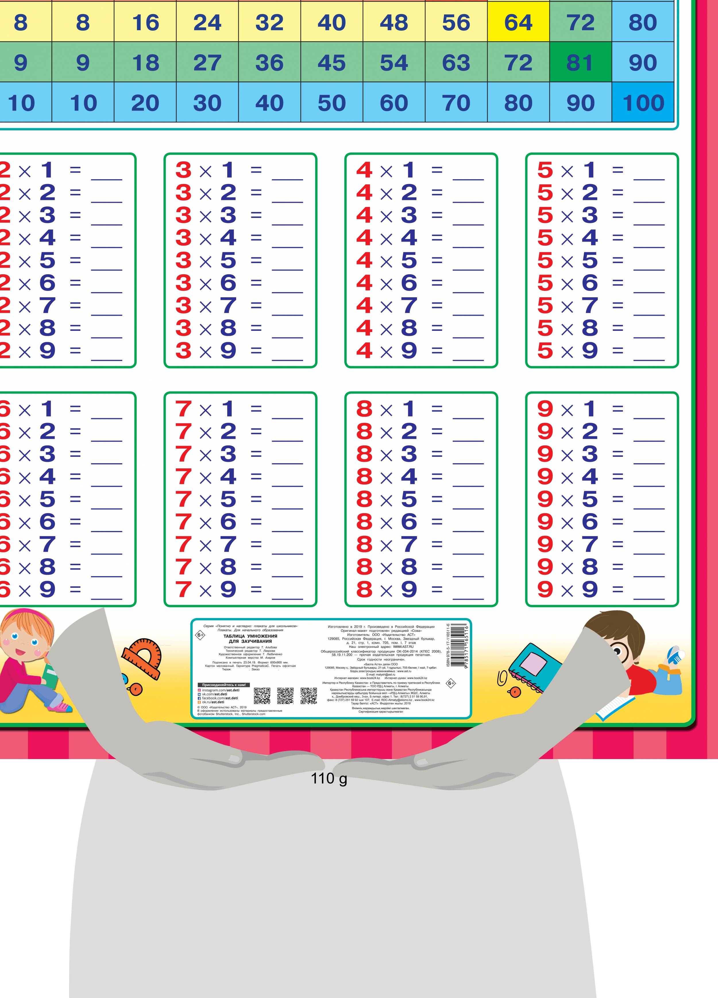 О чем эта книга Плакат поможет без особого труда выучить таблицу умножения. Кому эта книга будет интересна Пособие для заучивания таблицы умножения пригодится всем школьникам. Каковы особенности этой книги • Плакат можно повесить на стену и обращаться к нему в любое удобное время. • Развивает визуальную память. • Плакат сделан из плотного картона. • Можно использовать для обучения детей дома или в школе.