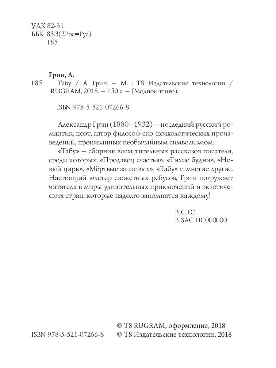 «Табу» - сборник восхитительных рассказов писателя, среди которых: «Продавец счастья», «Тихие будни», «Новый цирк», «Мёртвые за живых», «Табу» и многие другие. Настоящий мастер сюжетных ребусов, Грин погружает читателя в миры удивительных приключений и экзотических стран, которые надолго запомнятся каждому!