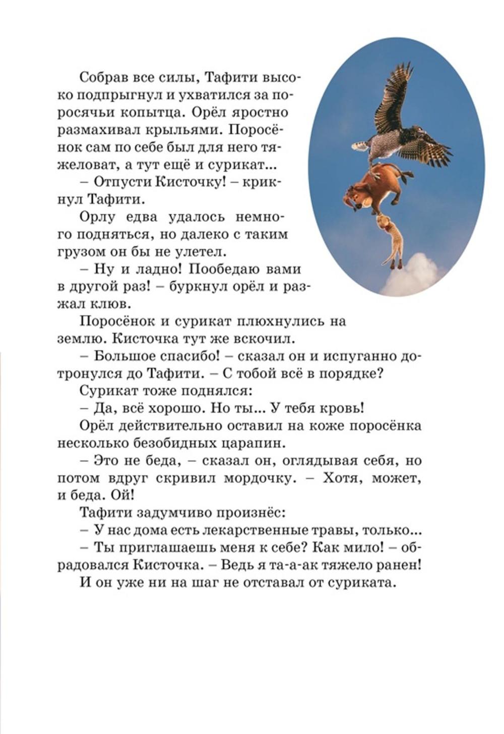 Может быть, вам уже знакома история о том, как любознательный сурикат Тафити отправился на край света и в пути повстречал Кисточку - невероятно талантливого кистеухого поросёнка. Но в этой книге вы найдёте другой рассказ об этой судьбоносной встрече - ещё более удивительный и захватывающий... Читайте сказку и следите в кино за приключениями двух лучших в саванне друзей. Тафити и Кисточка - впервые на большом экране! В основу сценария легла серия сказочных повестей знаменитой немецкой писательницы Юлии Бёме - автора многочисленных бестселлеров.| Издательство | Махаон |