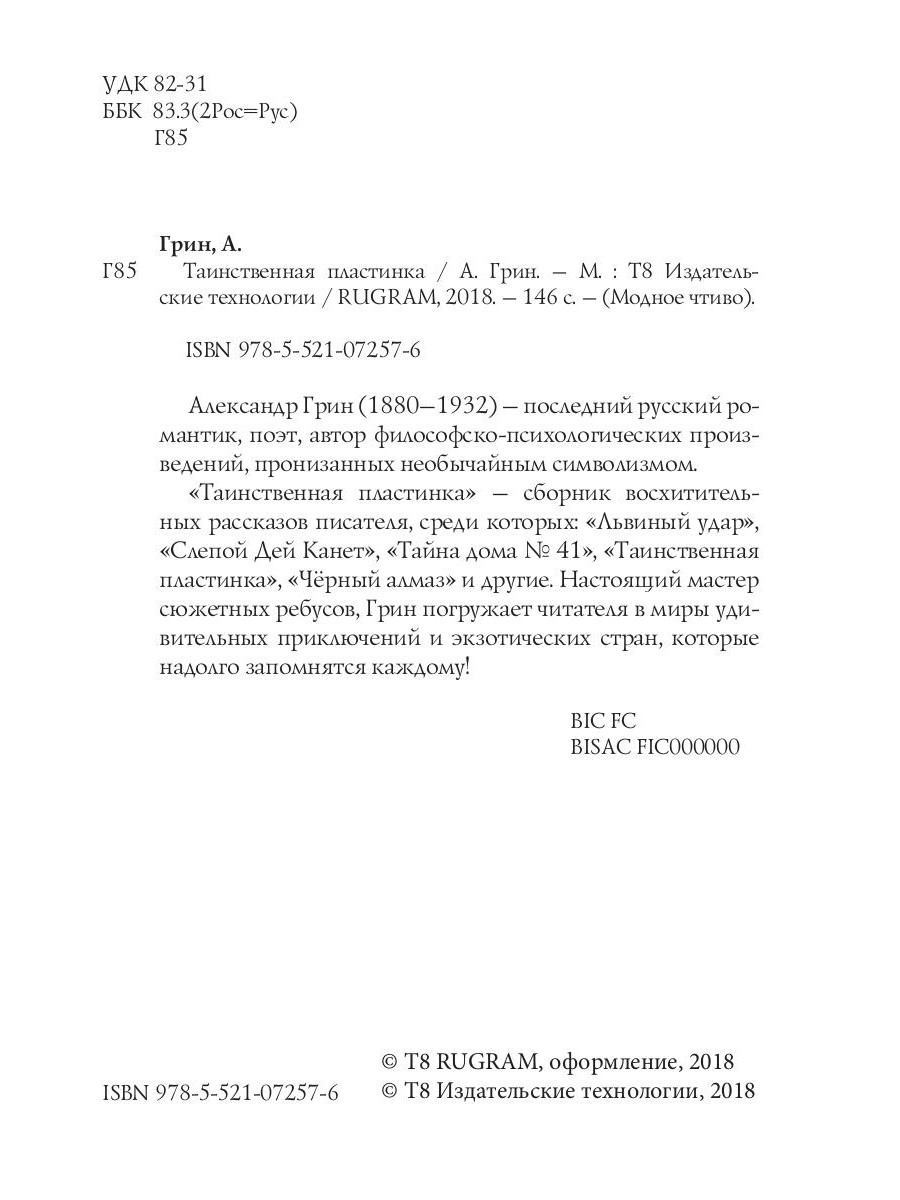 «Таинственная пластинка» - сборник восхитительных рассказов писателя, среди которых: «Львиный удар», «Слепой Дей Канет», «Тайна дома № 41», «Таинственная пластинка», «Чёрный алмаз» и другие. Настоящий мастер сюжетных ребусов, Грин погружает читателя в миры удивительных приключений и экзотических стран, которые надолго запомнятся каждому!