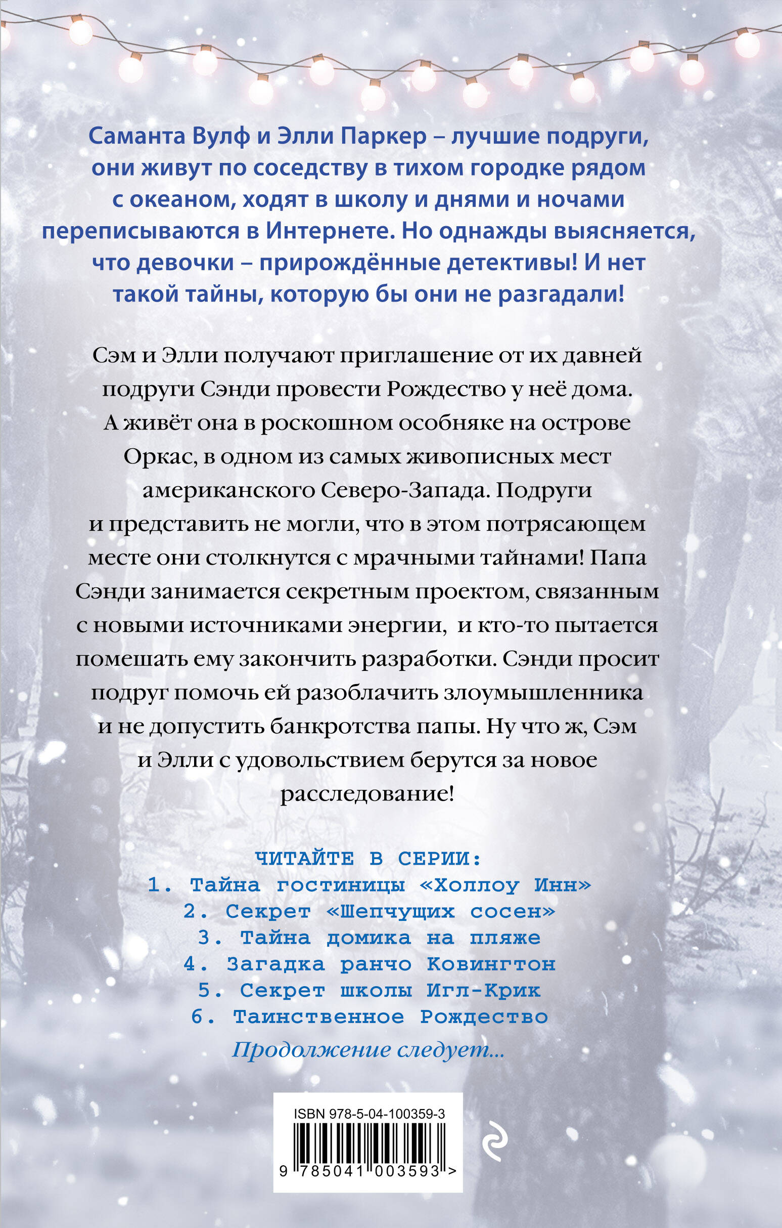 1. Саманта Вулф - обычная 12-летняя девочка. Её волнуют отношения с друзьями, общение в соцсетях, а ещё… опасные расследования! 2. Саманта и Элли - лучшие подруги, они живут по соседству в тихом городке рядом с океаном, ходят в школу и днями и ночами переписываются в Интернете. Но однажды выясняется, что девочки - прирождённые детективы! 3. Книги про Саманту Вулф расходятся огромными тиражами - не пропусти! 4. Если ты любишь захватывающий сюжет и интригу, не отпускающую до конца, расследования Саманты - то, что тебе нужно! 5. Саманта Вулф разгадает любую тайну!| Издательство | ООО "Издательство "Эксмо" |