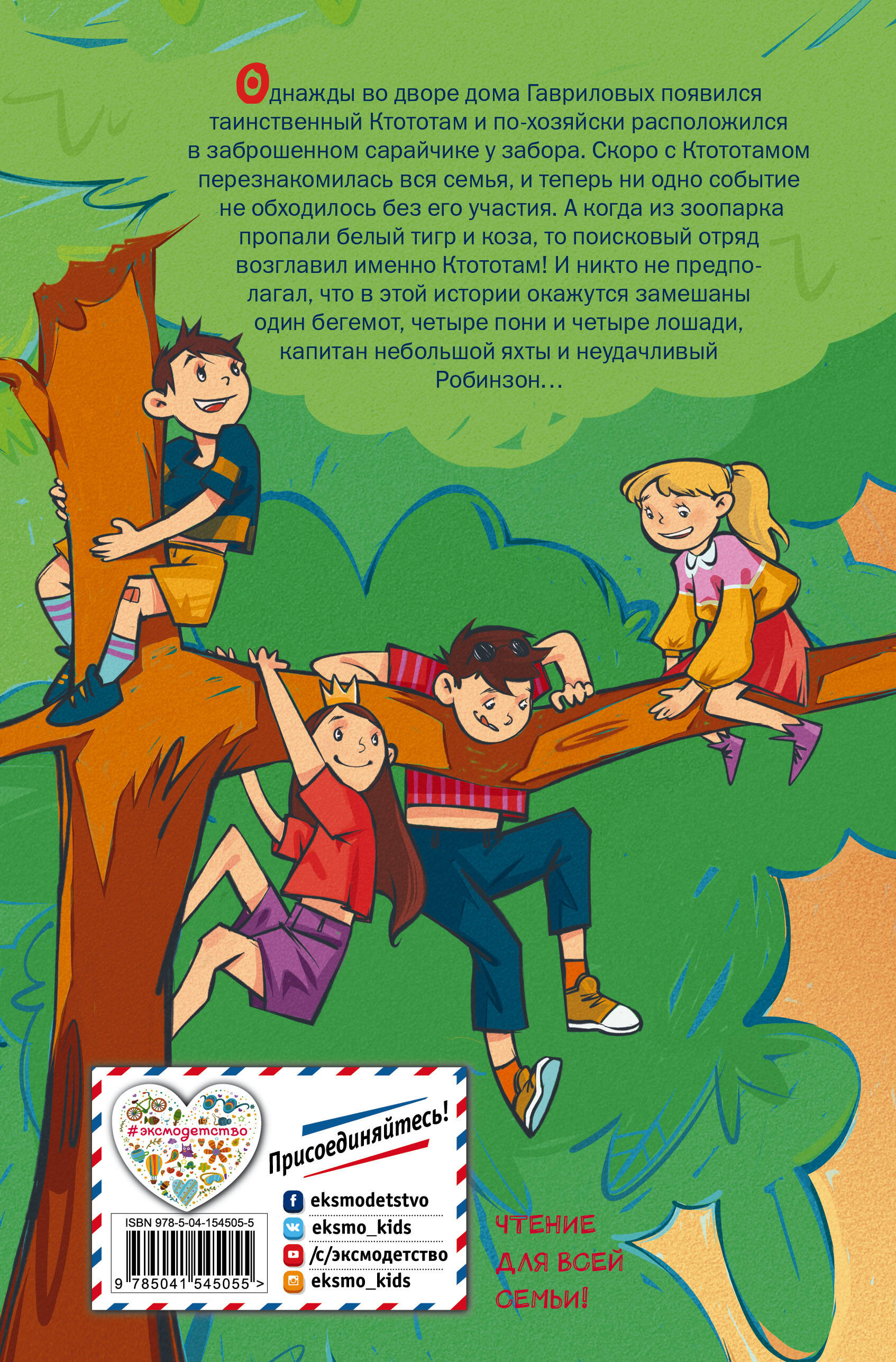 Однажды во дворе дома Гавриловых появился таинственный Ктототам и по-хозяйски расположился в заброшенном сарайчике у забора. Скоро с Ктототамом перезнакомилась вся семья, и теперь ни одно событие не обходилось без его участия. А когда из зоопарка пропали белый тигр и коза, то поисковый отряд возглавил именно Ктототам! И никто не предполагал, что в этой истории окажутся замешаны один бегемот, четыре пони и четыре лошади, капитан небольшой яхты и неудачливый Робинзон… Дмитрий не только творческий человек, но и отец большого семейства, где каждый день наполнен открытиями, маленькими чудесами, а главное - заботой друг о друге и любовью! Ежедневные наблюдения писателя за жизнью своей семьи вылились в эту звенящую смехом серию. Книга состоит из коротких историй, которые удобно читать вслух и которые ребенок с легкостью сможет прочитать сам.| Издательство | ООО "Издательство "Эксмо" |