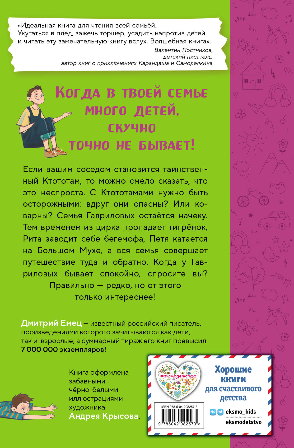 Возвращение замечательной семейной серии от известного автора Дмитрия Емца в новом оформлении! Когда в твоей семье много детей, скучно точно не бывает! Если вашим соседом становится таинственный Ктототам, то можно смело сказать, что это неспроста. С Ктототамами нужно быть осторожными: вдруг они опасны? Или коварны? Семья Гавриловых остаётся начеку. Тем временем из цирка пропадает тигрёнок, Рита заводит себе бегемофа, Петя катается на Большом Мухе, а вся семья совершает путешествие туда и обратно. Когда у Гавриловых бывает спокойно, спросите вы? Правильно - редко, но от этого только интереснее! Книга проиллюстрирована забавными чёрно-белыми рисунками художника Андрея Крысова, а яркие и стильные обложки будут отлично смотреться на любой полке! Крупный шрифт, белая бумага внутри! Подойдёт для самостоятельного чтения, внеклассного чтения, а также для чтения со взрослыми. ЦА: дети от 9 лет и взрослые.| Издательство | ООО "Издательство "Эксмо" |