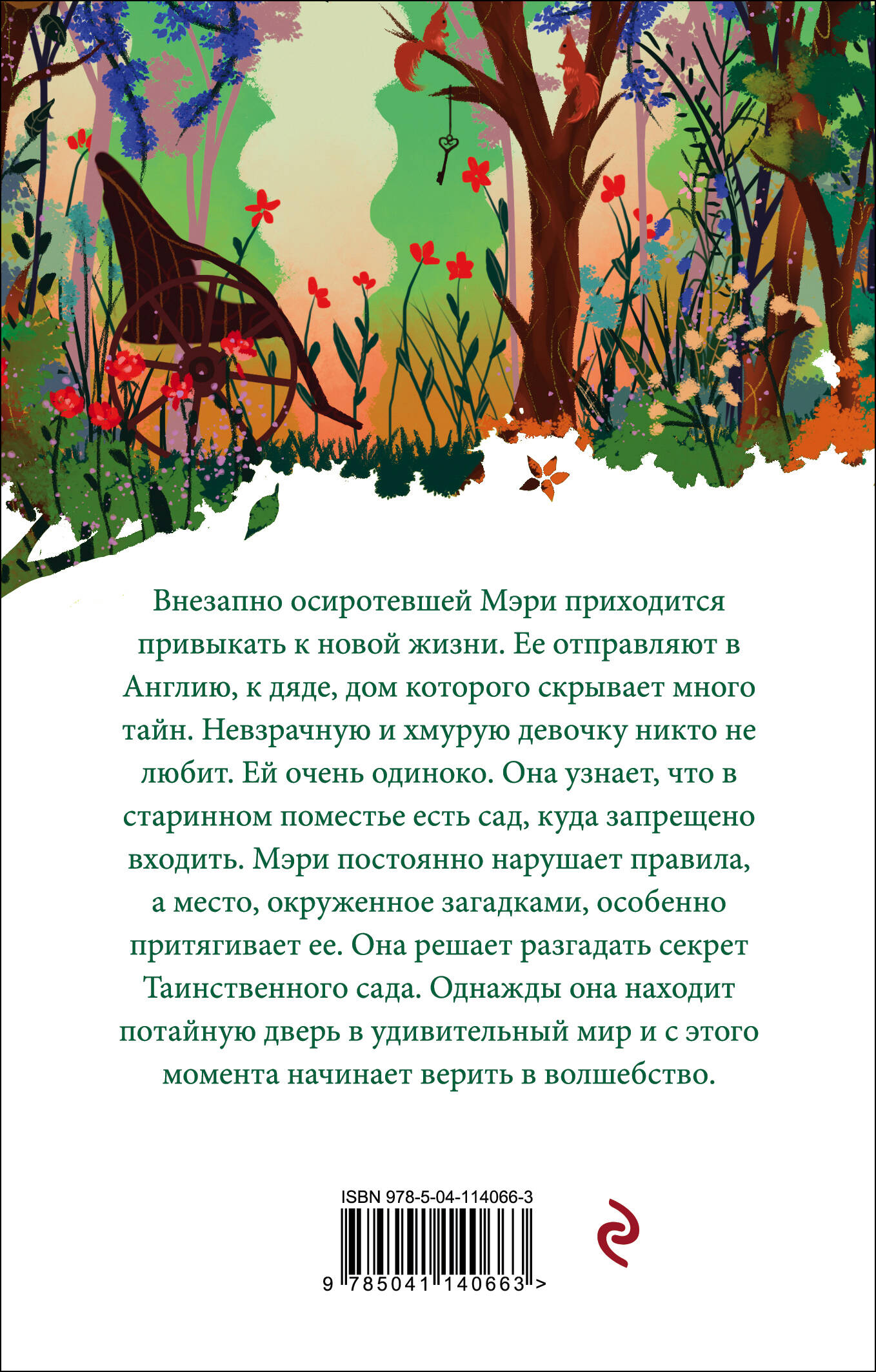 Внезапно осиротевшей Мэри приходится привыкать к новой жизни. Ее отправляют в Англию, к дяде, дом которого скрывает много тайн. Невзрачную и хмурую девочку никто не любит. Ей очень одиноко. Она узнает, что в старинном поместье есть сад, куда запрещено входить. Мэри постоянно нарушает правила, а место, окруженное загадками, особенно притягивает ее. Она решает разгадать секрет Таинственного сада. Однажды она находит потайную дверь в удивительный мир и с этого момента начинает верить в волшебство. Летом 2020 года вышла невероятно красивая экранизация по мотивам романа, в главных ролях Колин Фёрт и Дикси Эгерикс.| Издательство | ООО "Издательство "Эксмо" |