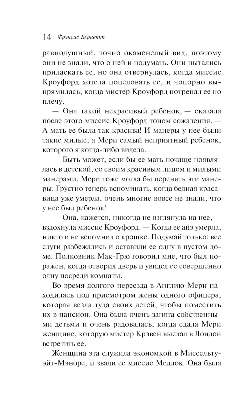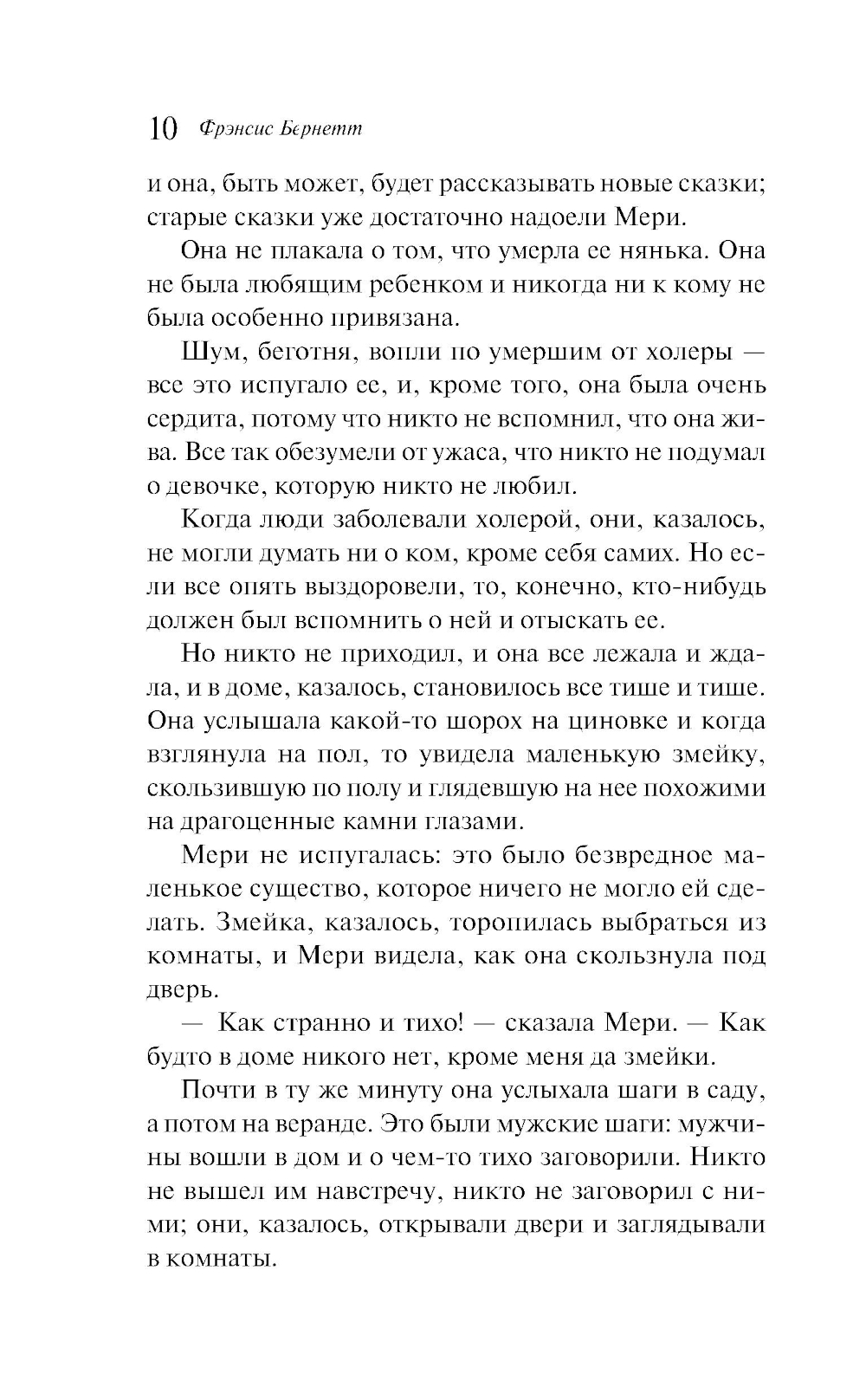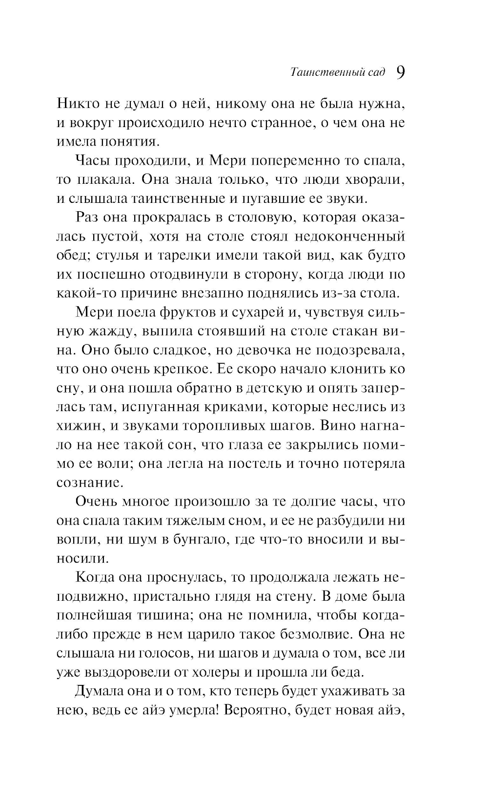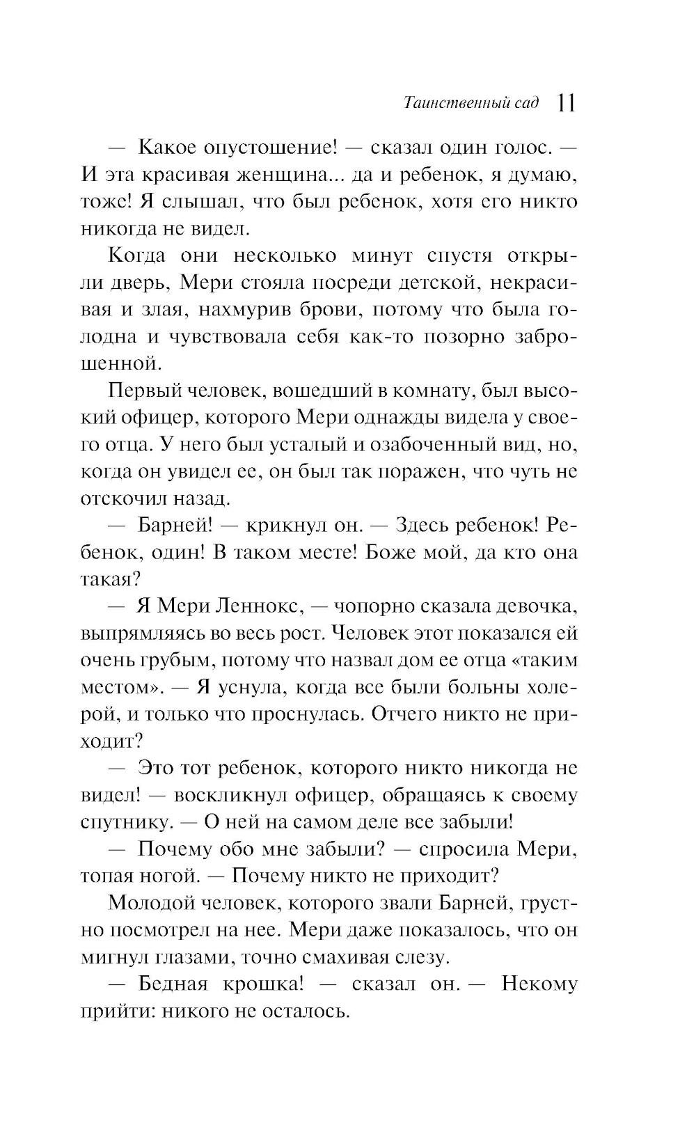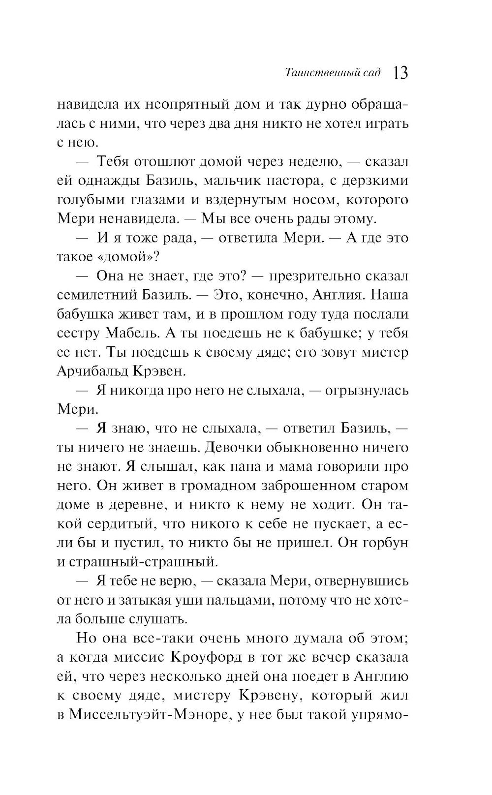 Внезапно осиротевшей Мэри приходится привыкать к новой жизни. Ее отправляют в Англию, к дяде, дом которого скрывает много тайн. Невзрачную и хмурую девочку никто не любит. Ей очень одиноко. Она узнает, что в старинном поместье есть сад, куда запрещено входить. Мэри постоянно нарушает правила, а место, окруженное загадками, особенно притягивает ее. Она решает разгадать секрет Таинственного сада. Однажды она находит потайную дверь в удивительный мир и с этого момента начинает верить в волшебство.| Издательство | Эксмо |