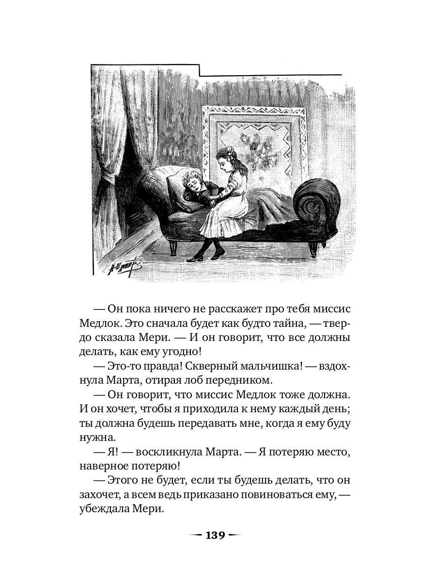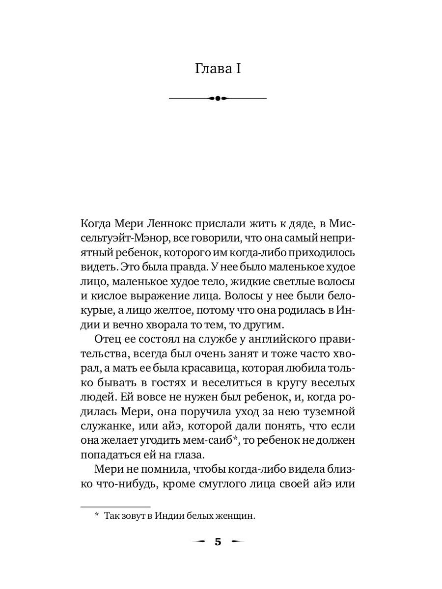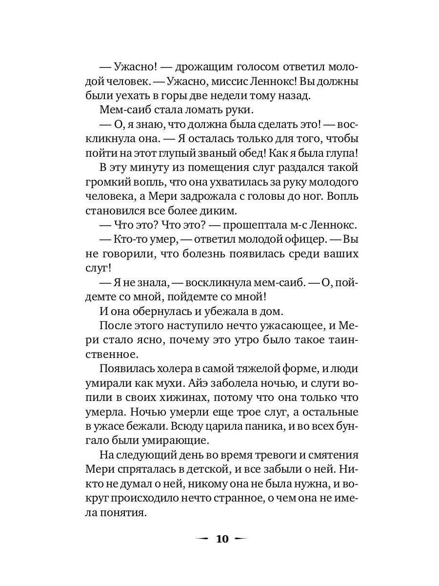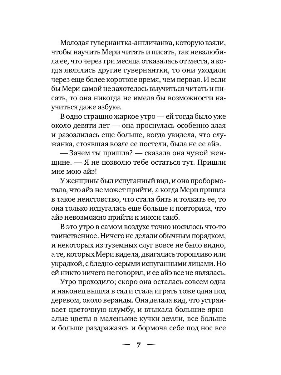 Как и обещает автор, эта книга полна таинственности и неожиданных поворотов сюжета. Десятилетняя Мери Леннокс никогда не чувствовала себя любимой. После смерти родителей ее отправляют жить к дяде, в глухое средневековое поместье. Многочисленные комнаты огромного дома закрыты, а по ночам девочка слышит чей-то плач. Случайно Мери узнает, что в поместье есть один сад, куда десять лет никто не заходил, его калитка заперта, а ключ хозяин поместья зарыл в землю. Постепенно мрачное поместье раскрывает девочке свои тайны, а девочка открывает сердце добру и любви. Фрэнсис Бёрнетг задумала одну из своих лучших книг, занимаясь разбивкой сада около дома. В ней особенно отразились ценности, которые так были важны для писательницы, - это личное достоинство и способность прийти на помощь ближнему.