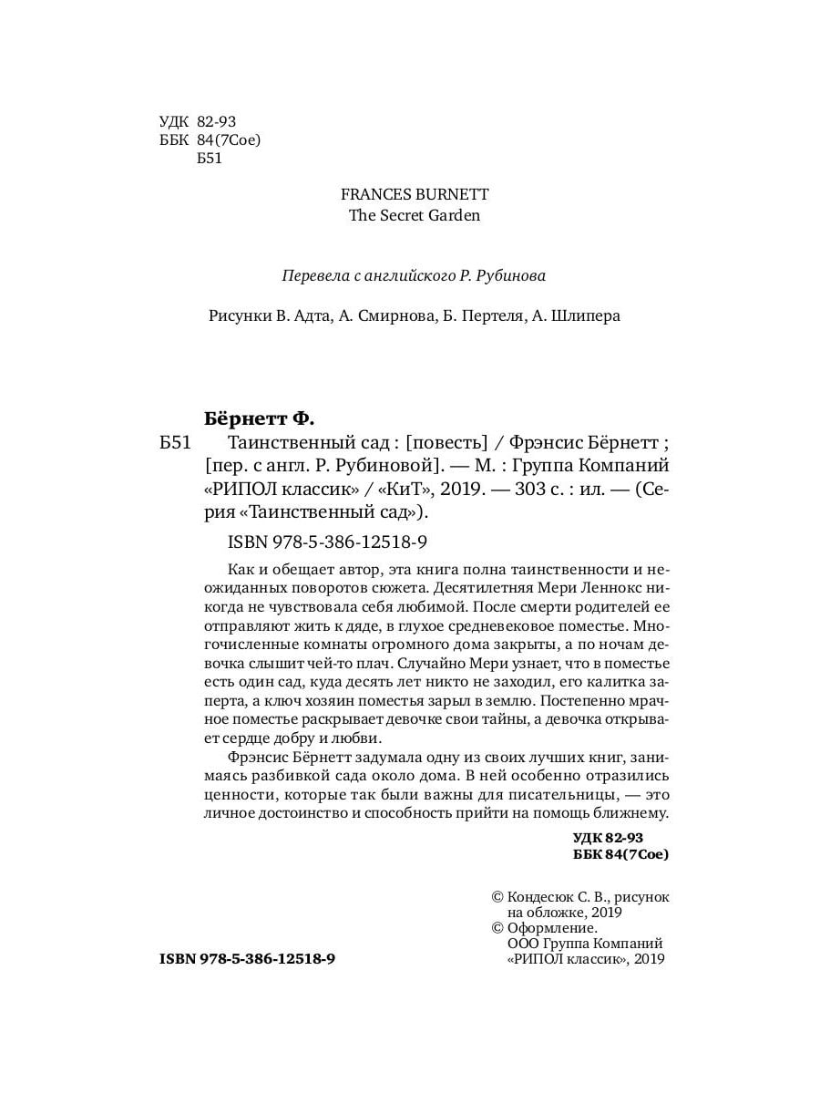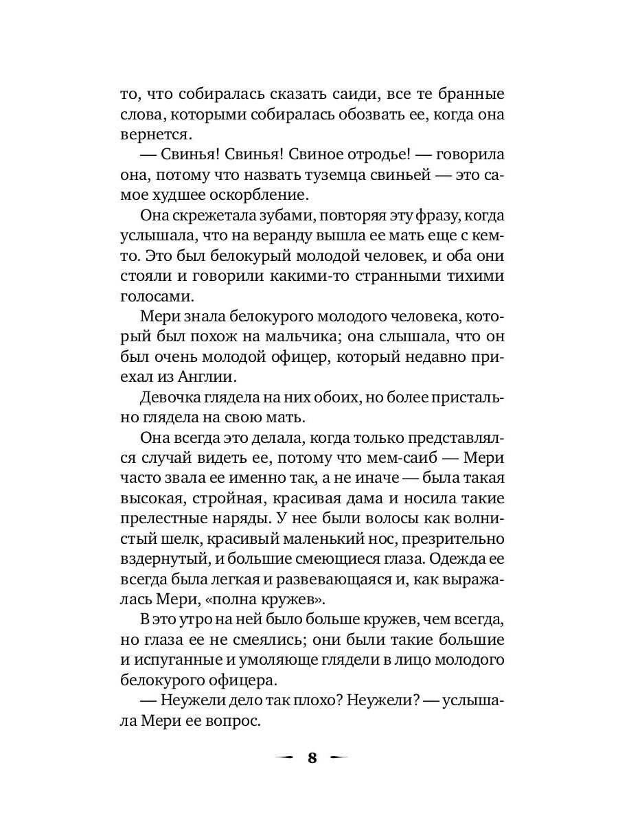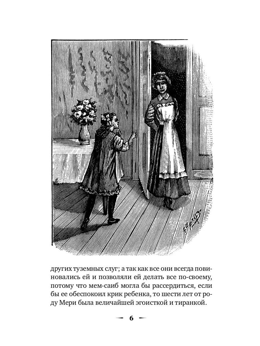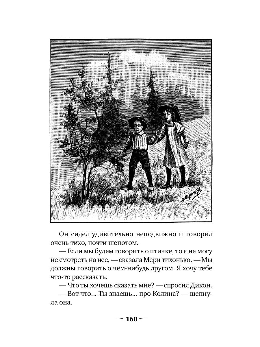 Как и обещает автор, эта книга полна таинственности и неожиданных поворотов сюжета. Десятилетняя Мери Леннокс никогда не чувствовала себя любимой. После смерти родителей ее отправляют жить к дяде, в глухое средневековое поместье. Многочисленные комнаты огромного дома закрыты, а по ночам девочка слышит чей-то плач. Случайно Мери узнает, что в поместье есть один сад, куда десять лет никто не заходил, его калитка заперта, а ключ хозяин поместья зарыл в землю. Постепенно мрачное поместье раскрывает девочке свои тайны, а девочка открывает сердце добру и любви. Фрэнсис Бёрнетг задумала одну из своих лучших книг, занимаясь разбивкой сада около дома. В ней особенно отразились ценности, которые так были важны для писательницы, - это личное достоинство и способность прийти на помощь ближнему.
