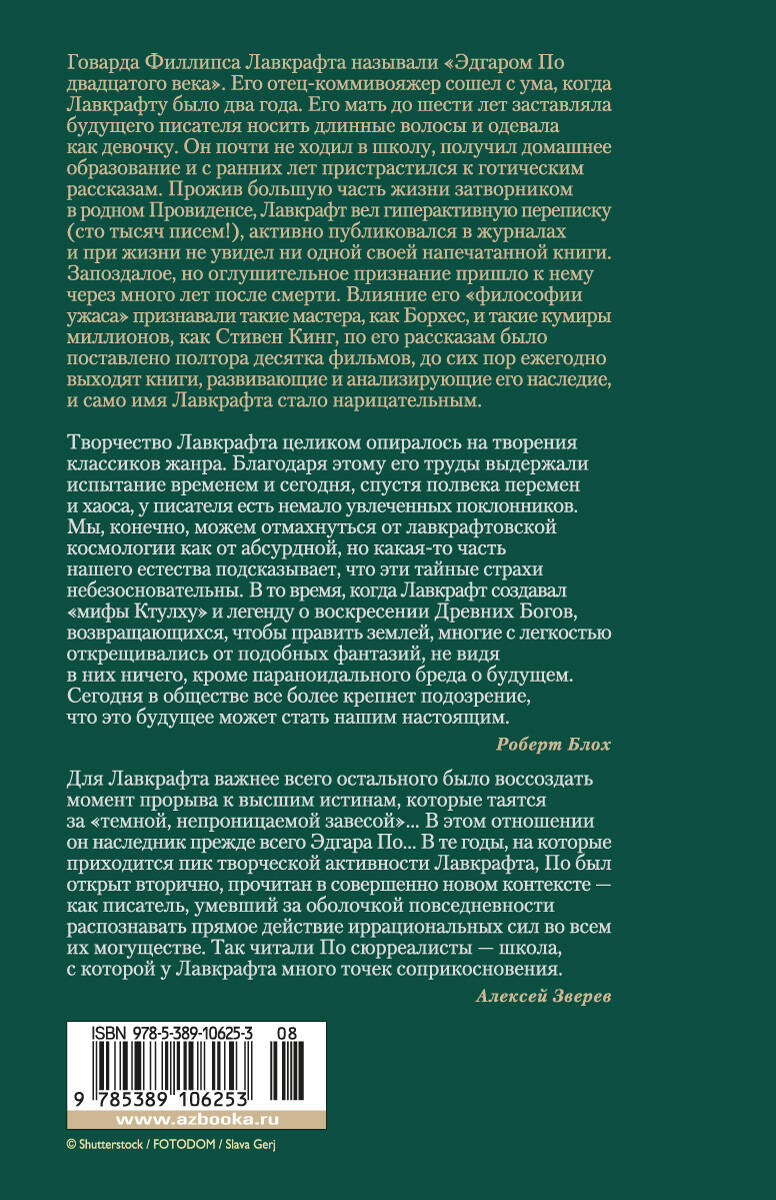 Говард Филлипс Лавкрафт, не опубликовавший при жизни ни одной книги, сделался маяком и ориентиром целого жанра, кумиром как широких читательских масс, так и рафинированных интеллектуалов, неиссякаемым источником вдохновения для кинематографистов, да и само его имя стало нарицательным. Сам Борхес восхищался его рассказами, в которых место человека - на далекой периферии вселенской схемы вещей, а силы надмирные вселяют в души неосторожных священный ужас. Данный сборник включает рассказы и повести, дописанные по оставшимся после Лавкрафта черновикам его другом, учеником и первым издателем Августом Дерлетом.| Издательство | Азбука-Аттикус Издат.группа ООО |