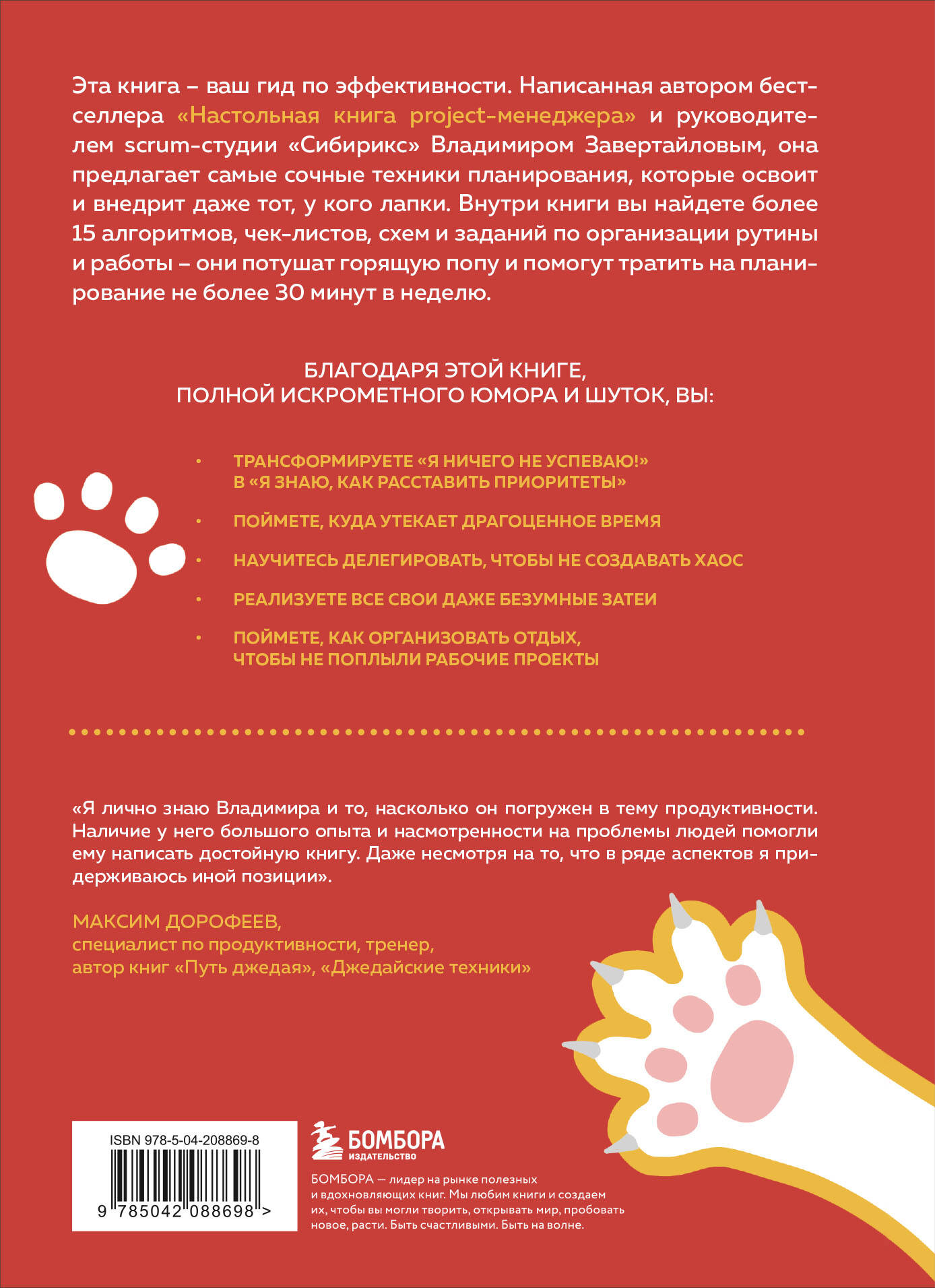 Эта книга - ваш гид по эффективности. Написанная автором бестселлера «Настольная книга project-менеджера» и руководителем scrum-студии «Сибирикс» Владимиром Завертайловым, она предлагает самые сочные техники планирования, которые освоит и внедрит даже тот, у кого лапки. Внутри книги вы найдете более 15 алгоритмов, чек-листов схем и заданий по организации рутины и работы - они потушат горящую попу и помогут тратить на планирование не более 30 минут в неделю. Благодаря этой книге, полной искрометного юмора и шуток, вы: • трансформируете «Я ничего не успеваю!» в «Я знаю, как расставить приоритеты»; • поймете, куда утекает драгоценное время; • научитесь делегировать, чтобы не создавать хаос; • реализуете все свои даже безумные затеи; • поймете, как организовать отдых, чтобы не поплыли рабочие проекты.