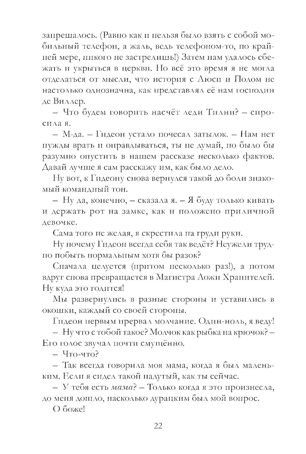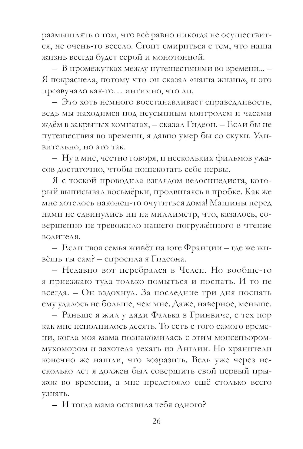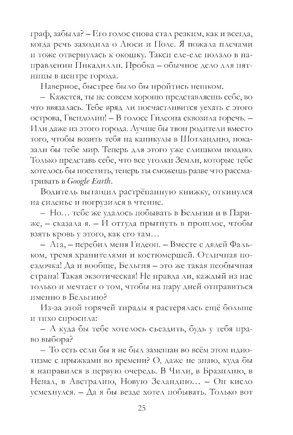 В истории общества путешественников во времени есть явные пробелы и темные места. Гвендолин чувствует, что за всем этим кроется страшная тайна, заговор, но как это доказать Гидеону и всем вокруг? Тайные коды, шифры и послания, погони, стрельба, призраки, все это ждет главных героев на пути к разгадке тайны. Сможет ли Гидеон убедить Гвендолин, что все его чувства - это не игра, излечить разбитое сердце подруги и спасти ее от смертельной опасности?