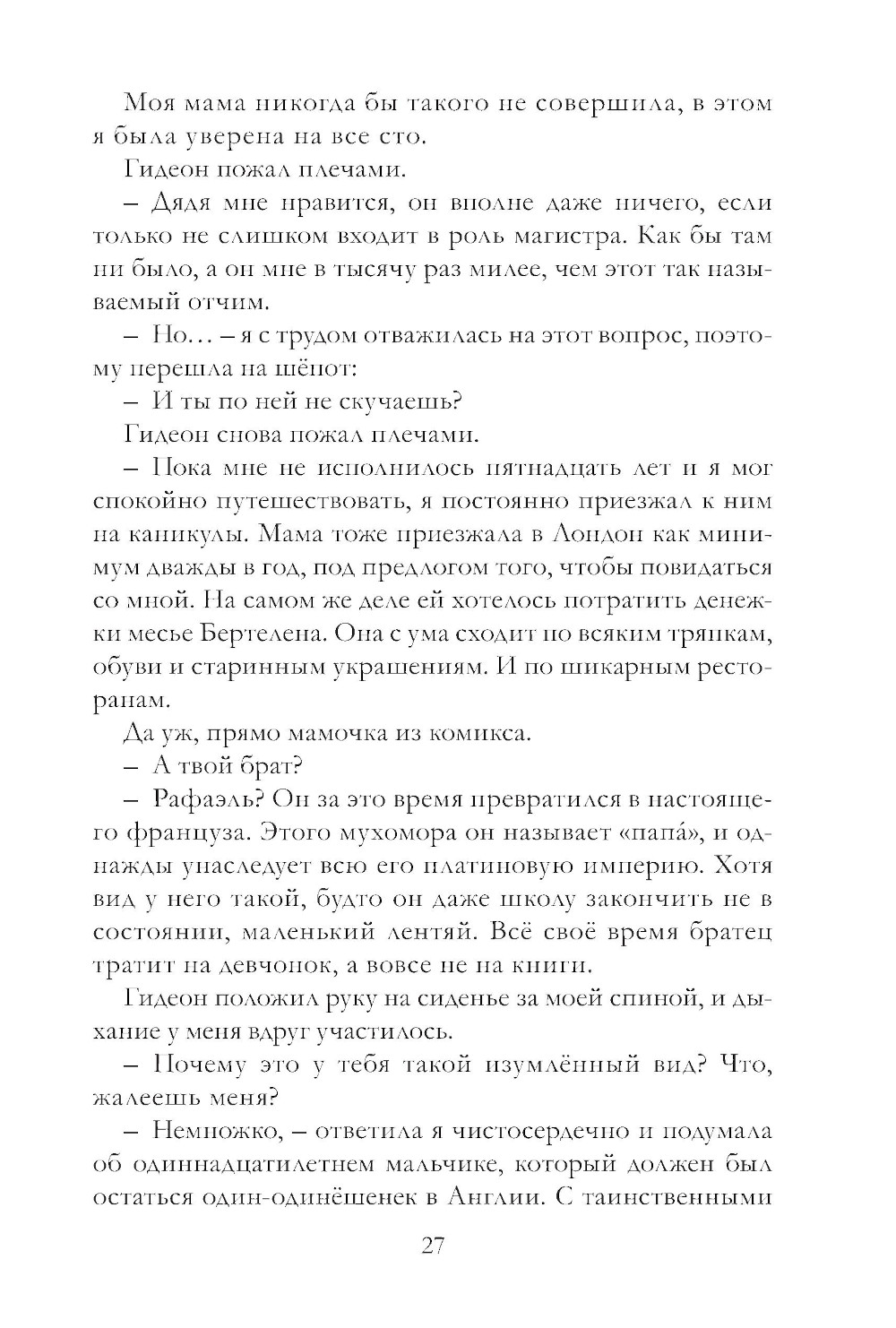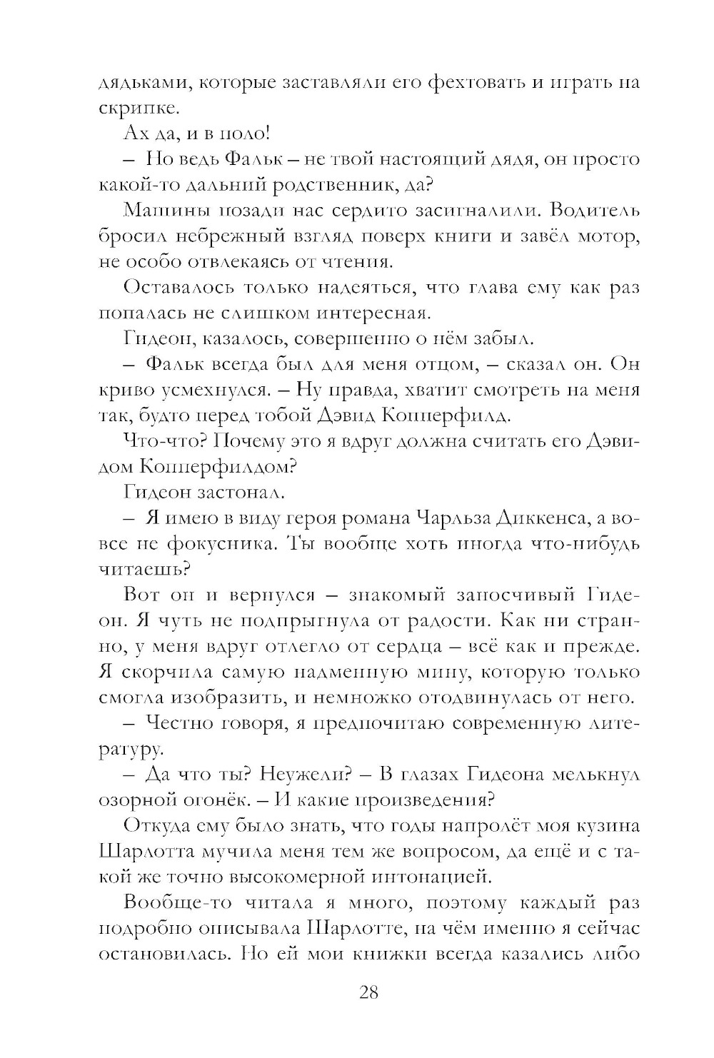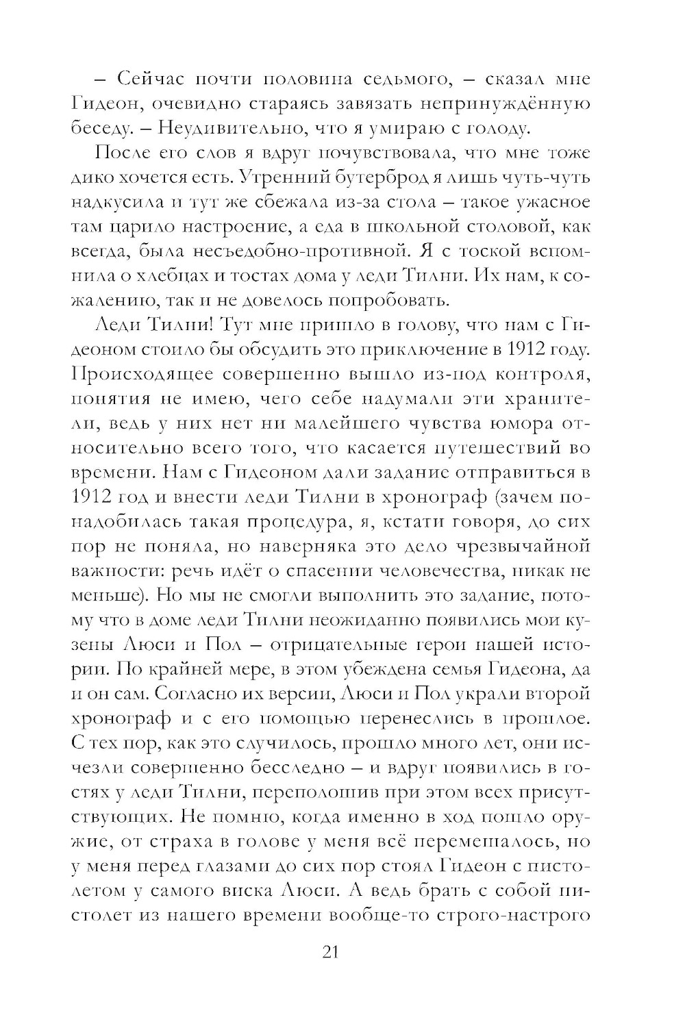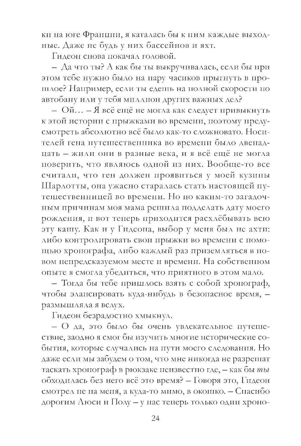 В истории общества путешественников во времени есть явные пробелы и темные места. Гвендолин чувствует, что за всем этим кроется страшная тайна, заговор, но как это доказать Гидеону и всем вокруг? Тайные коды, шифры и послания, погони, стрельба, призраки, все это ждет главных героев на пути к разгадке тайны. Сможет ли Гидеон убедить Гвендолин, что все его чувства - это не игра, излечить разбитое сердце подруги и спасти ее от смертельной опасности?