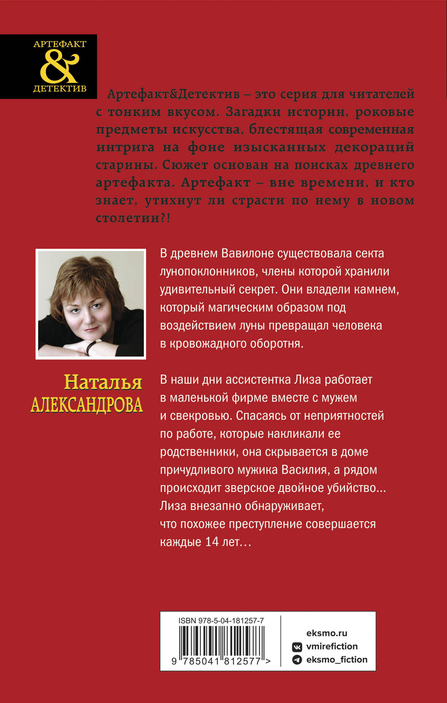 В древнем Вавилоне существовала секта лунопоклонников, члены которой хранили удивительный секрет. Они владели камнем, который магическим образом под воздействием луны превращал человека в кровожадного оборотня. В наши дни ассистентка Лиза работает в маленькой фирме вместе с мужем и свекровью. Спасаясь от неприятностей по работе, которую накликали на нее родственники, она скрывается в доме причудливого мужика Василия, а рядом происходит зверское двойное убийство... Лиза внезапно обнаруживает, что похожее преступление совершается каждые 14 лет… Читайте новый захватывающий «Артефакт&Детектив» от мастера жанра Натальи Александровой.| Издательство | ООО "Издательство "Эксмо" |