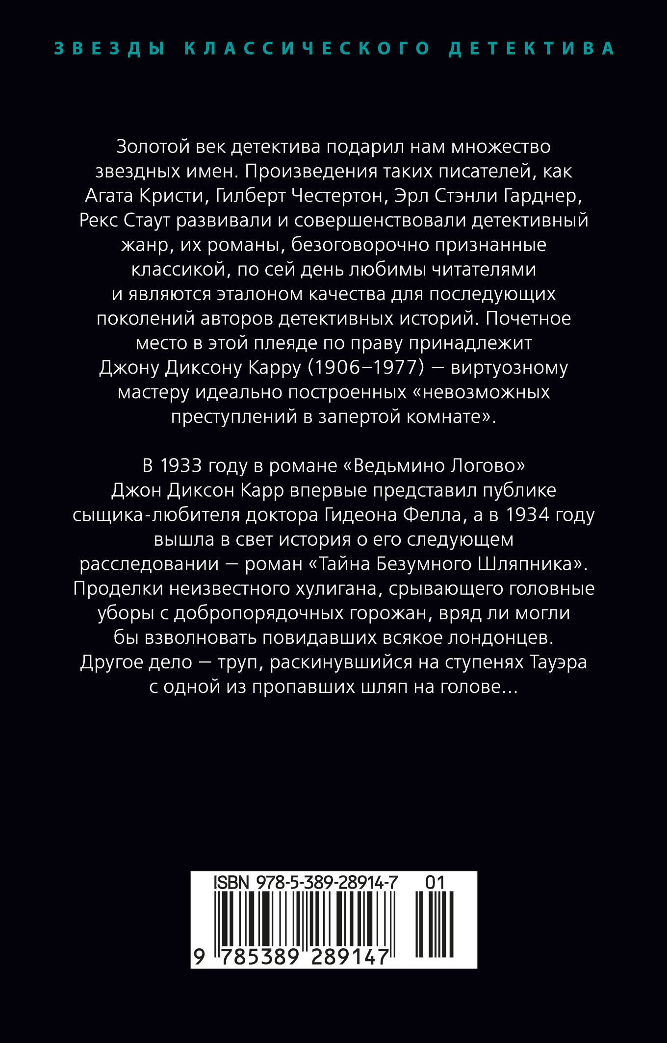 Золотой век детектива подарил нам множество звездных имен. Произведения таких писателей, как Агата Кристи, Гилберт Честертон, Эрл Стэнли Гарднер, Рекс Стаут развивали и совершенствовали детективный жанр, их романы, безоговорочно признанные классикой, по сей день любимы читателями и являются эталоном качества для последующих поколений авторов детективных историй. Почетное место в этой плеяде по праву принадлежит Джону Диксону Карру (1906-1977) - виртуозному мастеру идеально построенных "невозможных преступлений в запертой комнате". В 1933 году в романе "Ведьмино Логово" Джон Диксон Карр впервые представил публике сыщика-любителя доктора Гидеона Фелла, а в 1934 году вышла в свет история о его следующем расследовании - роман "Тайна Безумного Шляпника". Проделки неизвестного хулигана, срывающего головные уборы с добропорядочных горожан, вряд ли могли бы взволновать повидавших всякое лондонцев. Другое дело - труп, раскинувшийся на ступенях Тауэра с одной из пропавших шляп на голове...| Издательство | Азбука-Аттикус Издат.группа ООО |