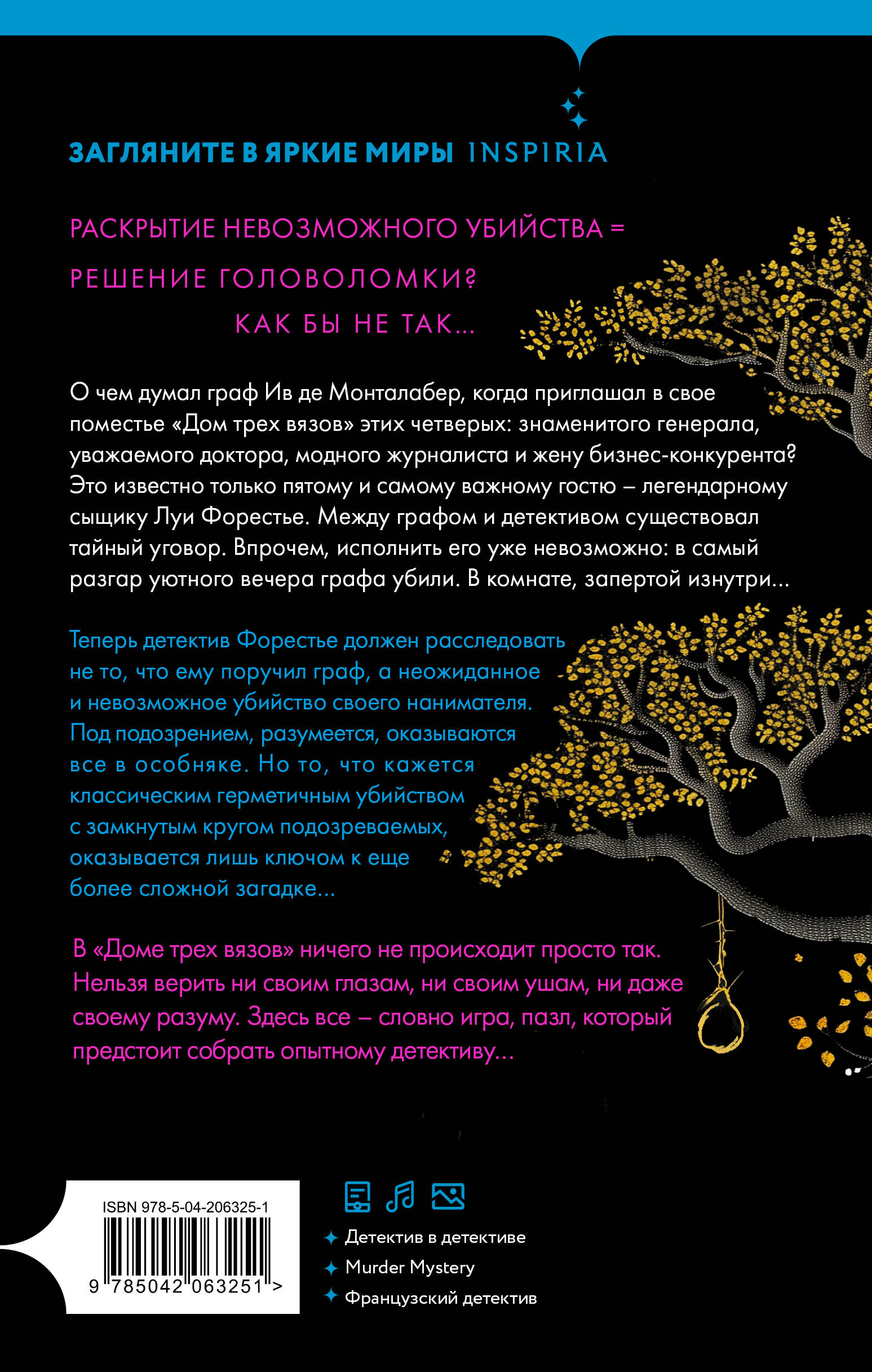 НАЦИОНАЛЬНЫЙ БЕСТСЕЛЛЕР ФРАНЦИИ. Раскрытие невозможного убийства = решение головоломки? Как бы не так… О чем думал граф Ив де Монталабер, когда приглашал в свое поместье «Дом трех вязов» этих четверых: знаменитого генерала, уважаемого доктора, модного журналиста и жену бизнес-конкурента? Это известно только пятому и самому важному гостю - легендарному сыщику Луи Форестье. Между графом и детективом существовал тайный уговор. Впрочем, исполнить его уже невозможно: в самый разгар уютного вечера графа убили. В комнате, запертой изнутри… Теперь детектив Форестье должен расследовать не то, что ему поручил граф, а неожиданное и невозможное убийство своего нанимателя. Под подозрением, разумеется, оказываются все в особняке. Но то, что кажется классическим герметичным убийством с замкнутым кругом подозреваемых, оказывается лишь ключом к еще более сложной загадке… В «Доме трех вязов» ничего не происходит просто так. Нельзя верить ни своим глазам, ни своим ушам, ни даже своему разуму. Здесь все - словно игра, паззл, который предстоит собрать опытному детективу… «Если вам нравится играть в "Клуэдо", вы будете в восторге от истории, развурнувшейся в этом поместье.» - Elle «Блестящая композиция, саспенс сохраняется в потоке поразительных сюжетных поворотов.» - L'Éveil de le Haute-Loire «Сначала тебе кажется, что перед тобой лежит еще один классический герметичный детектив, но потом ты понимаешь, что он не так прост, и все это время автор водил тебя за нос. Но с каким упоением приходит это осознание! Игроки меняют свои роли, декорации падают и обнажается правда. Вы получите истинное удовольствие от того, как ловко вас обманули.» - Регина Скородумова, бренд-менеджер Inspiria| Издательство | ООО "Издательство "Эксмо" |