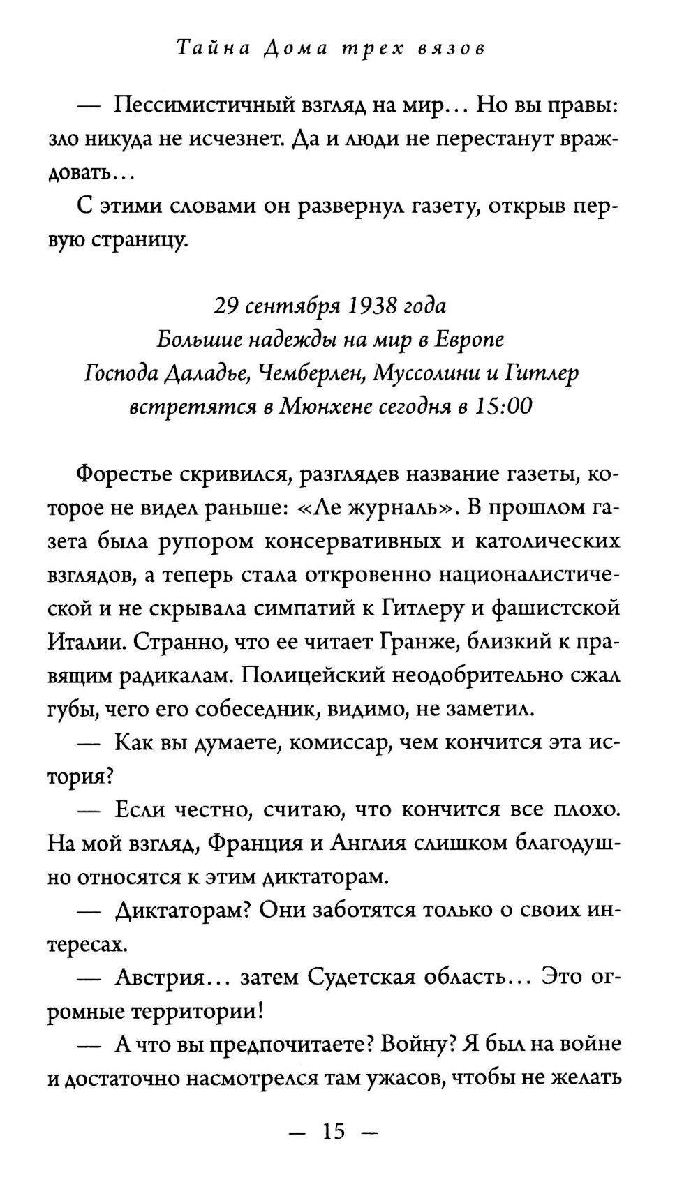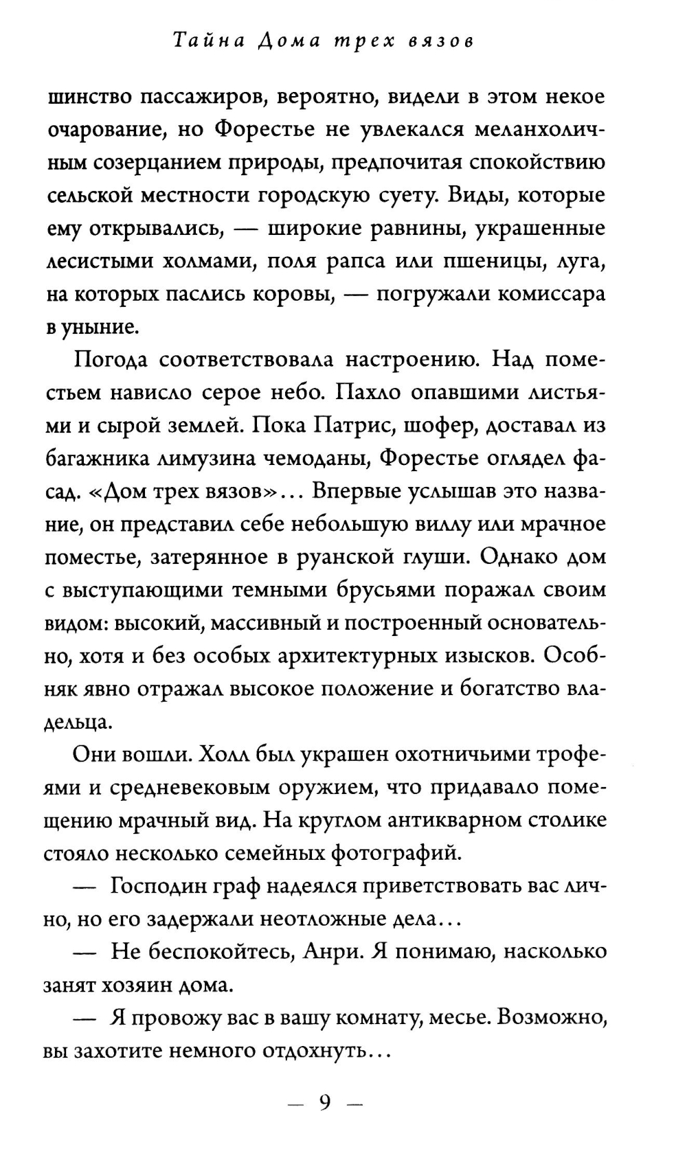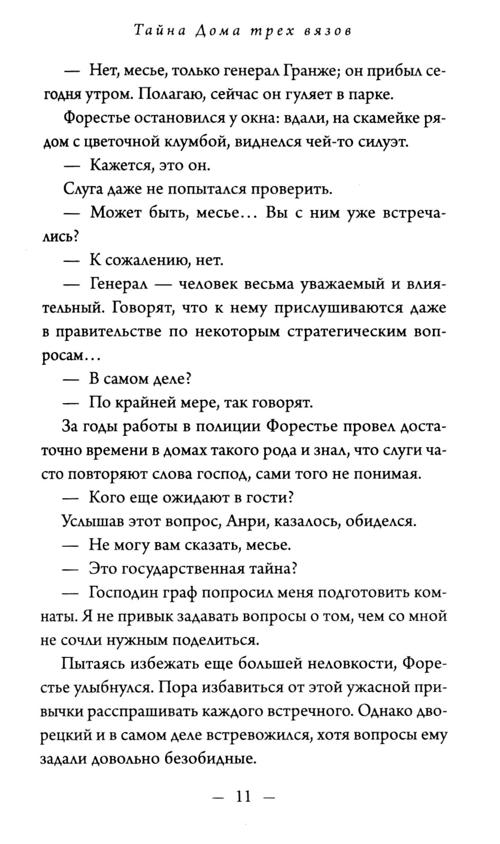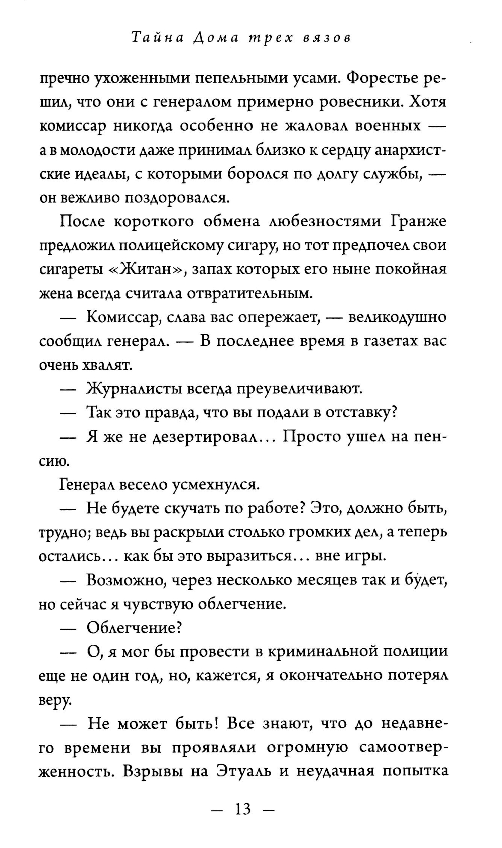 Раскрытие невозможного убийства = решение головоломки? Как бы не так... О чем думал граф Ив де Монталабер, когда приглашал в свое поместье «Дом трех вязов» этих четверых: знаменитого генерала, уважаемого доктора, модного журналиста и жену бизнес-конкурента? Это известно только пятому и самому важному гостю - легендарному сыщику Луи Форестье. Между графом и детективом существовал тайный уговор. Впрочем, исполнить его уже невозможно: в самый разгар уютного вечера графа убили. В комнате, запертой изнутри... Теперь детектив Форестье должен расследовать не то, что ему поручил граф, а неожиданное и невозможное убийство своего нанимателя. Под подозрением, разумеется, оказываются все в особняке. Но то, что кажется классическим герметичным убийством с замкнутым кругом подозреваемых, оказывается лишь ключом к еще более сложной загадке... В «Доме трех вязов» ничего не происходит просто так. Нельзя верить ни своим глазам, ни своим ушам, ни даже своему разуму. Здесь все - словно игра, паззл, который предстоит собрать опытному детективу…| Издательство | Эксмо |