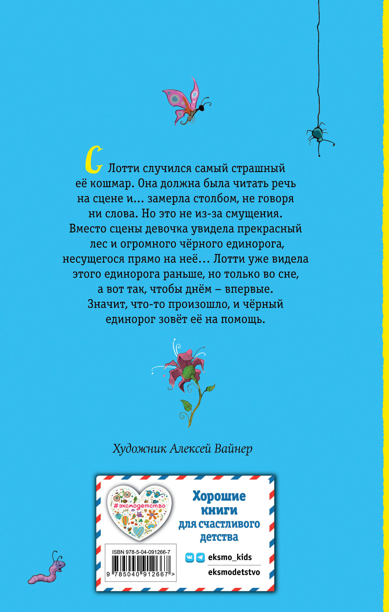 Иногда Лотти снилось, что она единорог и бежит по прекрасному лесу. В этом лесу всегда таилась тень - огромный чёрный единорог, издалека наблюдающий за ней. И вот он вновь явился ей, но теперь посреди дня, да ещё и в самый неудачный момент - когда девочка читала со сцены речь. Ему явно что-то нужно от Лотти, но что?