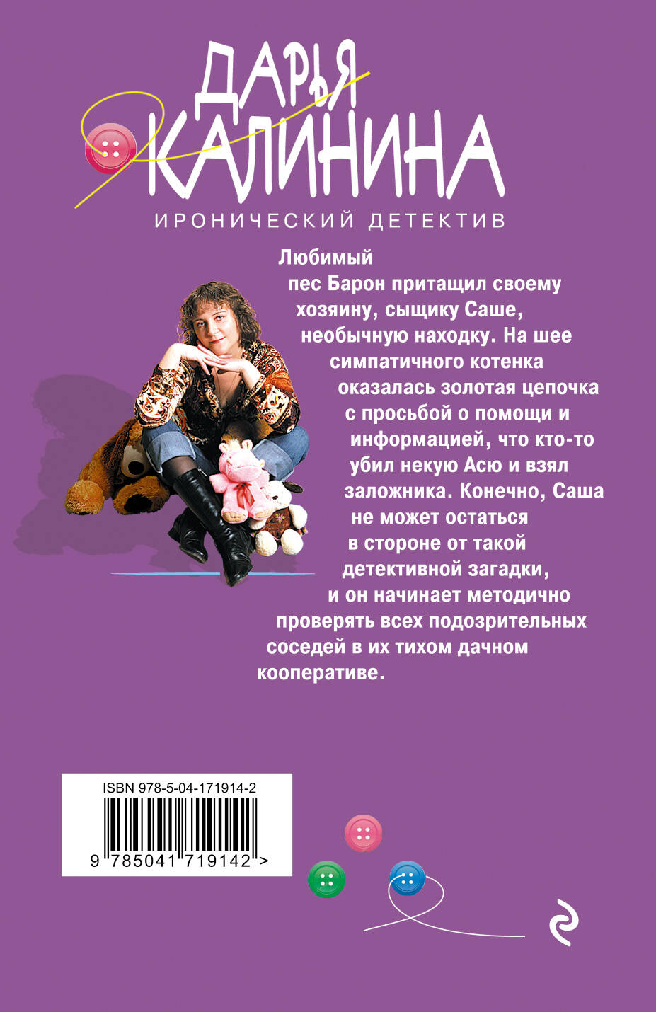 Любимый пес Барон притащил своему хозяину сыщику Саше необычную находку. На шее симпатичного котенка оказалась золотая цепочка с просьбой о помощи и информацией, что кто-то убил некую Асю и взял заложника. Конечно, Саша не может остаться в стороне от такой детективной загадки, и он начинает методично проверять всех подозрительных соседей в их тихом дачном кооперативе. Удастся ли Саше найти того, от кого убежал котенок с цепочкой, и как со всей этой историей связан коричневый чемоданчик - обо всем этом читайте в новом ироническом детективе Дарьи Калининой.| Издательство | ООО "Издательство "Эксмо" |