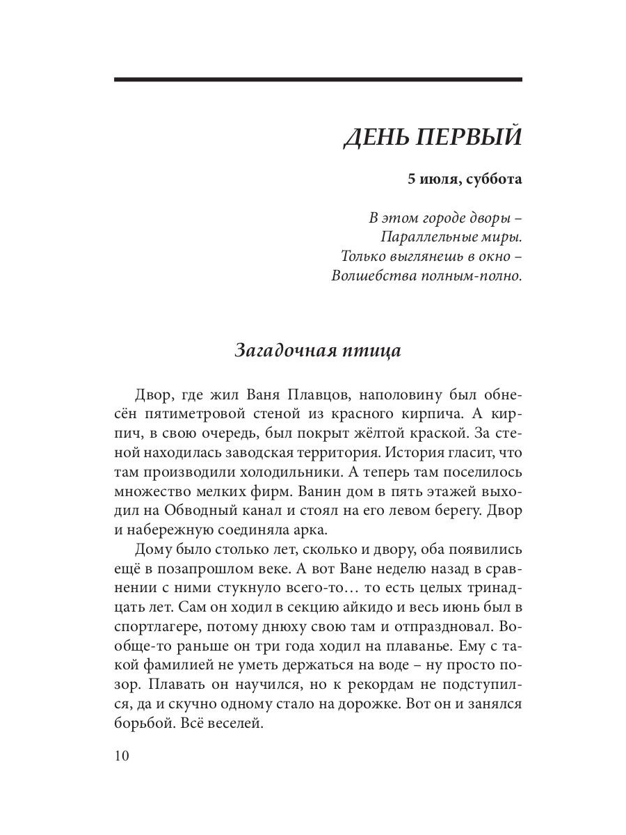 Летним петербургским днём тринадцатилетний Ваня собирается ехать на отдых, но у себя в парадной находит раненую загадочную птицу. Он откладывает поездку, ищет специализированную ветклинику. Но при странных обстоятельствах птица бесследно исчезает. Он пускается на её поиски. К нему присоединяется одноклассница и соседка по двору Кристина. На пути их ждут невероятные и опасные приключения с погонями, жуткими встречами и путешествиями в прошлое.| Издательство | Т8 RUGRAM |