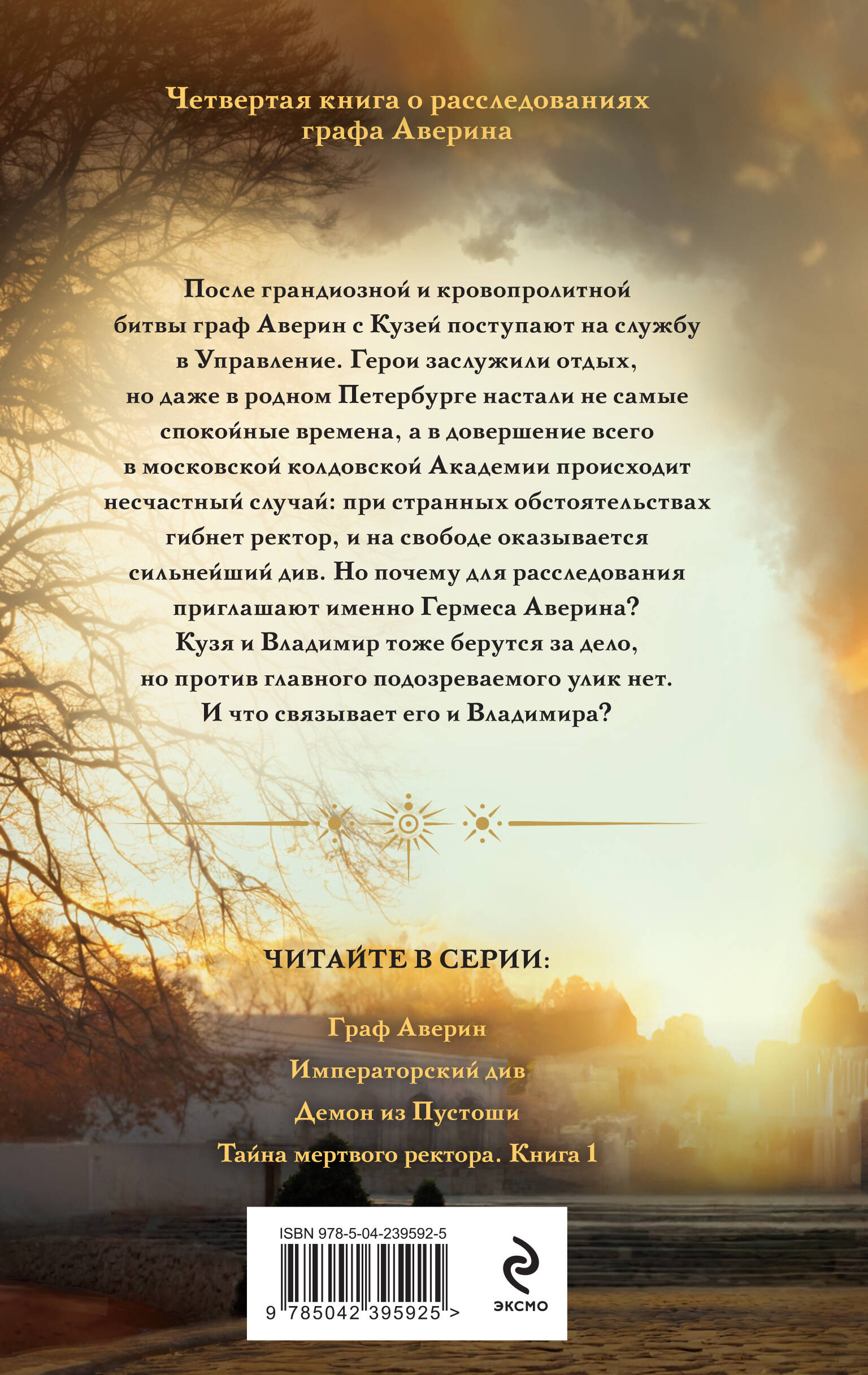 После грандиозной и кровопролитной битвы граф Аверин с Кузей поступают на службу в Управление. Герои заслужили отдых, но даже в родном Петербурге настали не самые спокойные времена, а в довершение всего в московской колдовской Академии происходит несчастный случай: при странных обстоятельствах гибнет ректор, и на свободе оказывается сильнейший див. Но почему для расследования приглашают именно Гермеса Аверина? Кузя и Владимир тоже берутся за дело, но против главного подозреваемого улик нет. И что связывает его и Владимира?| Издательство | ООО "Издательство "Эксмо" |