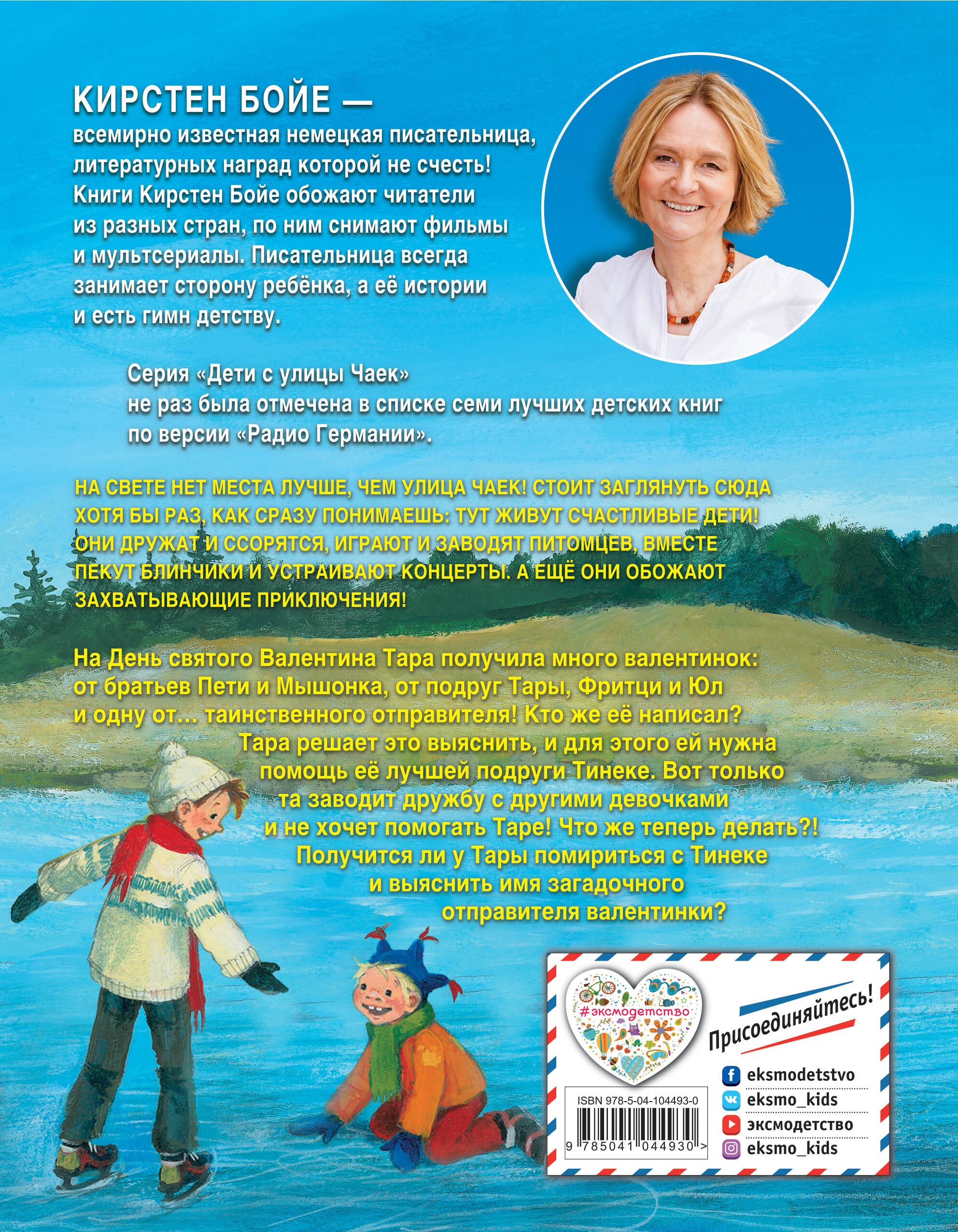 На День святого Валентина Тара получила много валентинок: от братьев Пети и Мышонка, от подруг Тары, Фритци и Юл, и одну от… таинственного отправителя! Кто же её написал? Тара решает это выяснить, и для этого ей нужна помощь её лучшей подруги Тинеке. Вот только та заводит дружбу с другими девочками и не хочет помогать Таре! Что же теперь делать?! Получится ли у Тары помириться с Тинеке и выяснить имя загадочного отправителя валентинки? Кирстен Бойе - всемирно известная немецкая писательница, обладатель немецкой молодёжной литературной премии и премии ЮНЕСКО. Её книги обожают читатели из разных стран, а по серии «Дети с улицы Чаек» даже сняли мультсериал. Главная идея всех произведений автора - ценность ребёнка и детства, полного чудес и открытий. Почти на каждой странице можно увидеть яркие красивые иллюстрации.