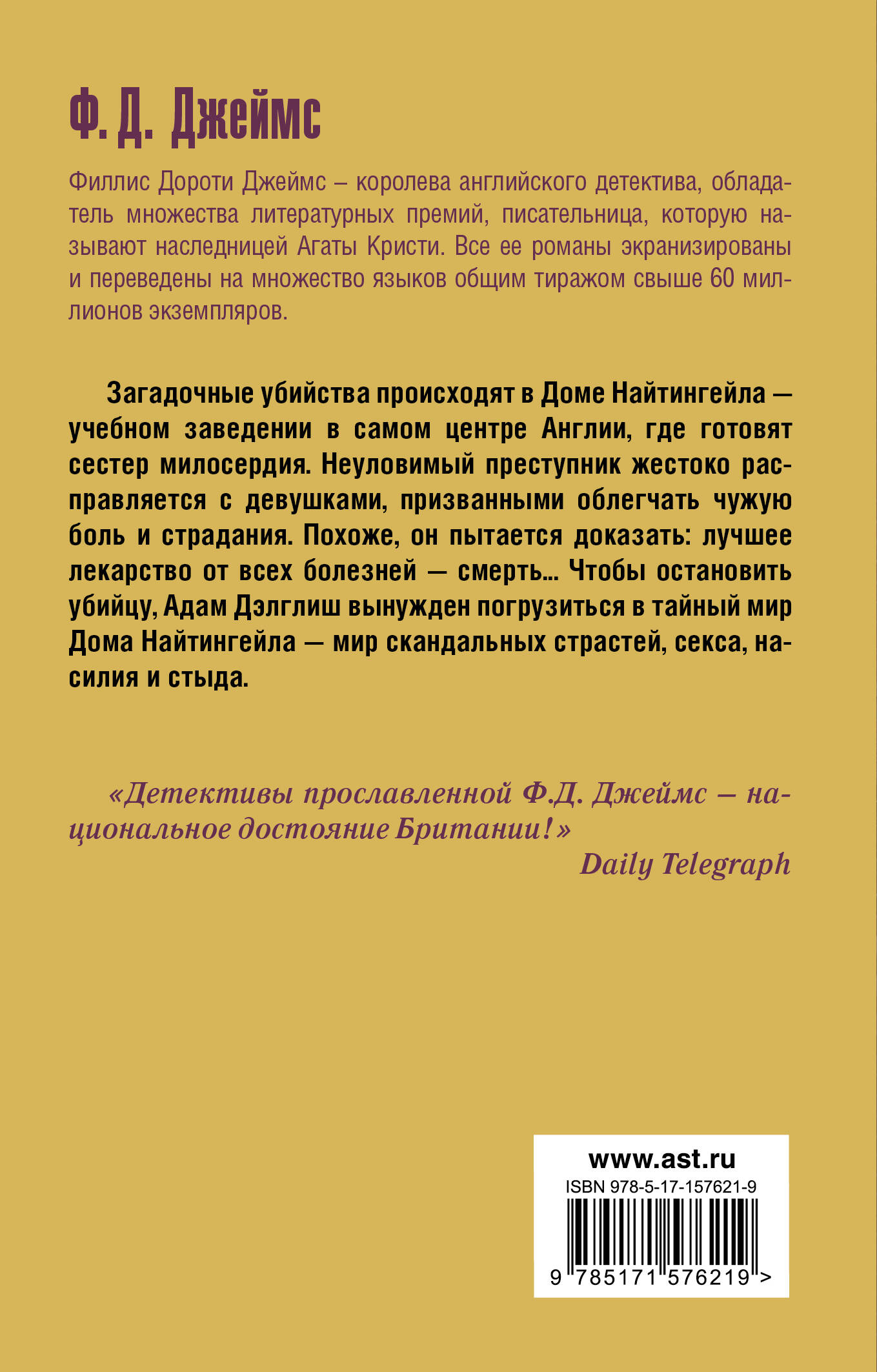 Загадочные убийства происходят в Доме Найтингейла -- учебном заведении в самом центре Англии, где готовят сестер милосердия. Неуловимый преступник жестоко расправляется с девушками, призванными облегчать чужую боль и страдания. Похоже, он пытается доказать: лучшее лекарство от всех болезней -- смерть...Чтобы остановить убийцу, Адам Дэлглиш вынужден погрузиться в тайный мир Дома Найтингейла -- мир скандальных страстей, секса, насилия и стыда.| Издательство | ИЗДАТЕЛЬСТВО "АСТ" |