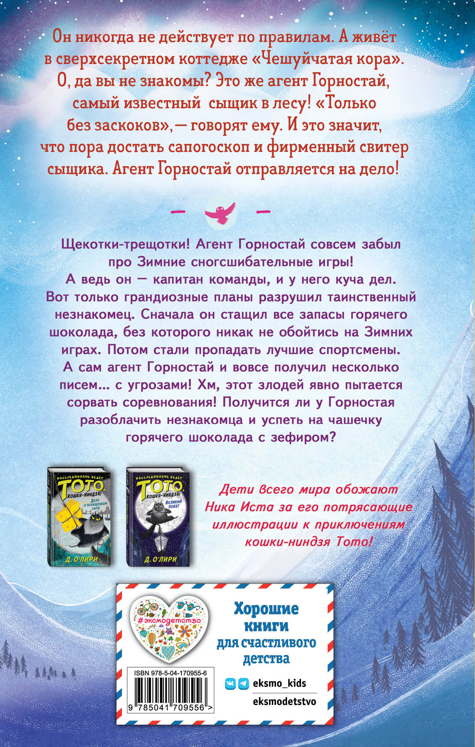 Кочки-пенёчки! Сегодня же начало Зимних сногсшибательных игр! А Горностай совсем об этом забыл… И как теперь всё успеть? К тому же, поблизости опять маячит таинственный злодей. Он стащил все запасы горячего шоколада, без которого не обойтись на Зимних играх. Следом исчезли самые известные спортсмены. Да и сам Горностай получил несколько записок с угрозами. Щекотки-трещотки, пора поймать злодея. И наконец-то выпить чашечку горячего шоколада в хорошей компании!