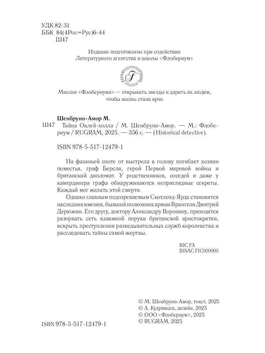 На фазаньей охоте от выстрела в голову погибает хозяин поместья, граф Берсли, герой Первой мировой войны и британский дипломат. У родственников, соседей и даже у камердинера графа обнаруживаются неприглядные секреты. Каждый мог желать этой смерти. Однако главным подозреваемым Скотленд-Ярда становится наследник имения, бывший полковник армии Врангеля Дмитрий Дерюжин. Его другу, доктору Александру Воронину, приходится разорвать сеть взаимной поруки британской аристократии, вскрыть преступления разведывательных служб королевства и расследовать тайны самой жертвы.| Издательство | Т8 RUGRAM |