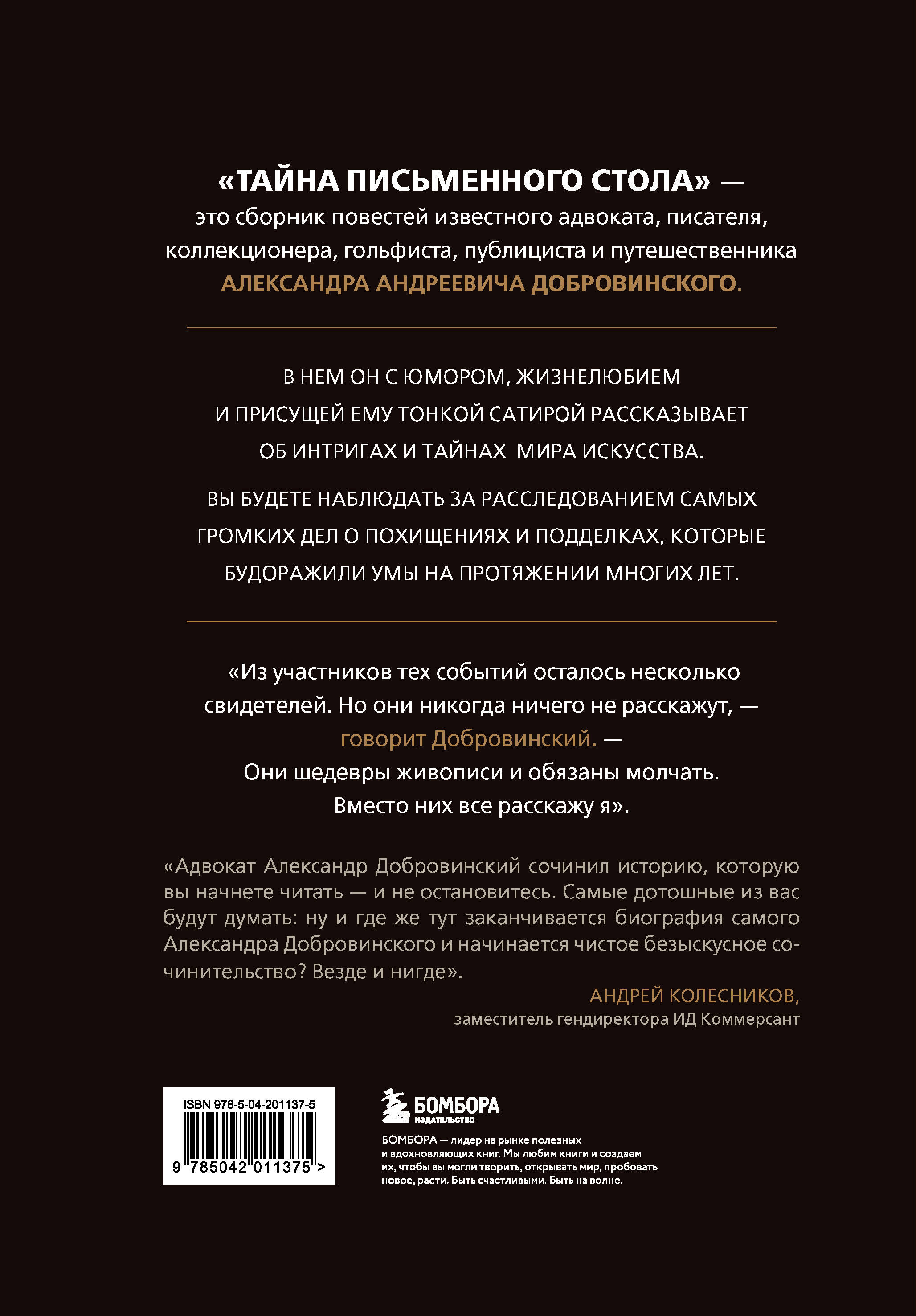 «Тайна письменного стола» - это сборник повестей известного адвоката, писателя, коллекционера, гольфиста, публициста и путешественника Александра Андреевича Добровинского. В нем он с юмором, жизнелюбием и присущей ему тонкой сатирой рассказывает об интригах и тайнах мира искусства. Вы будете наблюдать за расследованием самых громких дел о похищениях и подделках, которые будоражили умы на протяжении многих лет. «Из участников тех событий осталось несколько свидетелей. Но они никогда ничего не расскажут, - говорит Добровинский. - Они шедевры живописи и обязаны молчать. Вместо них все расскажу я». ОТЗЫВ «Адвокат Александр Добровинский сочинил историю, которую вы начнете читать - и не остановитесь. Самые дотошные из вас будут думать, ну и где же тут заканчивается биография самого Александра Добровинского и начинается чистое безыскусное сочинительство. И где? Везде и нигде». - Андрей Колесников, главный редактор журнала «Русский пионер», заместитель гендиректора «Коммерсант»| Издательство | ООО "Издательство "Эксмо" |